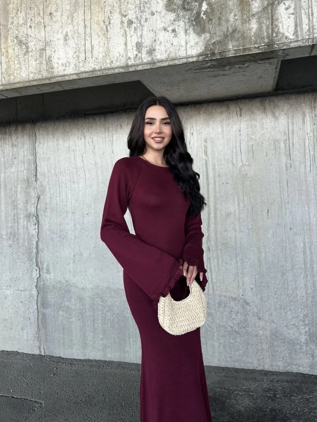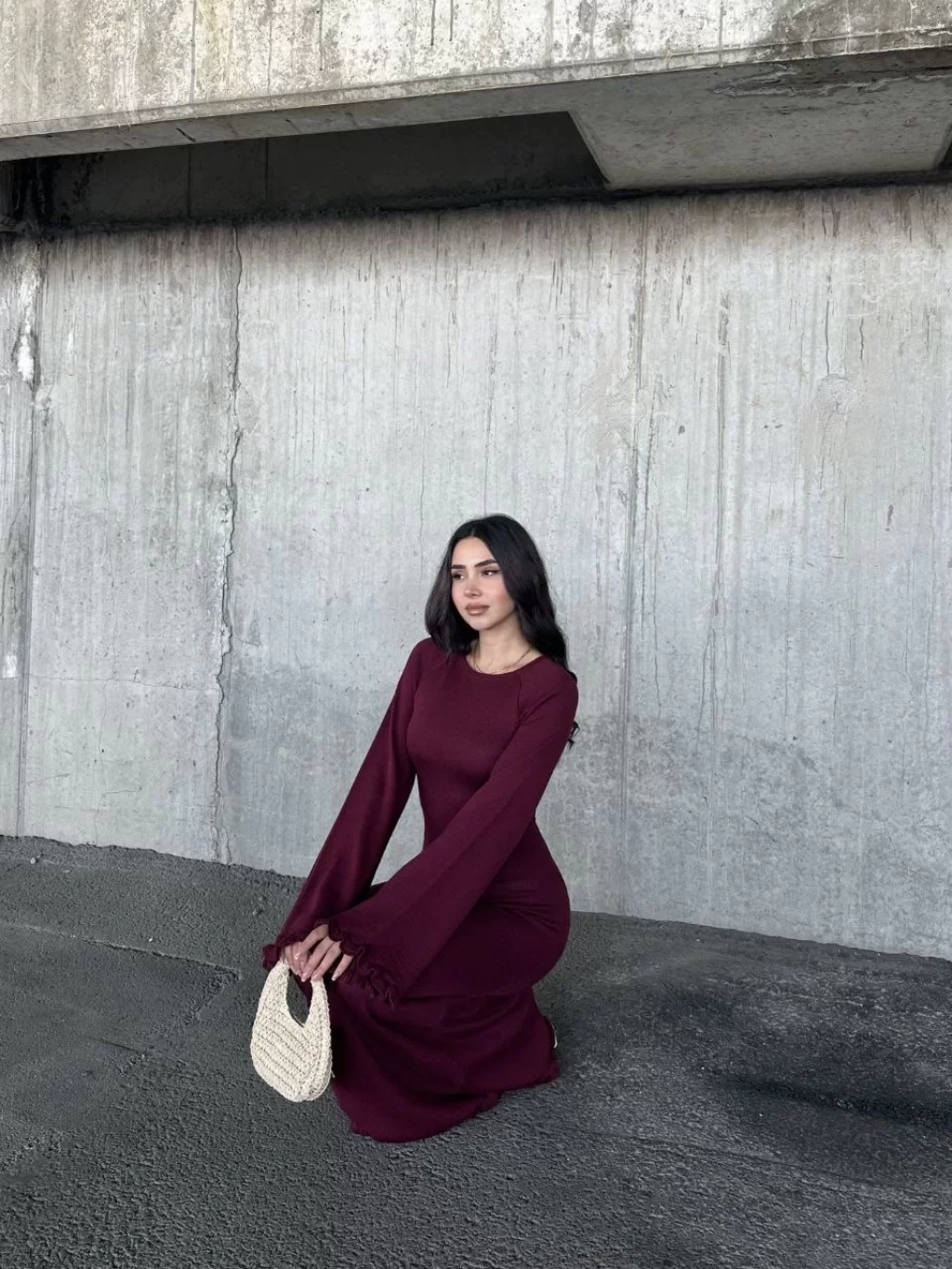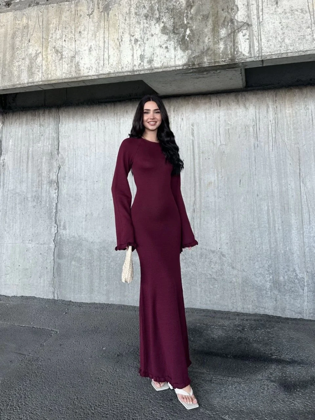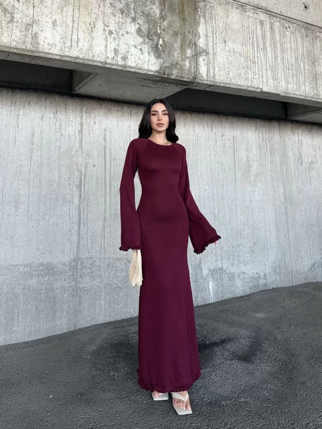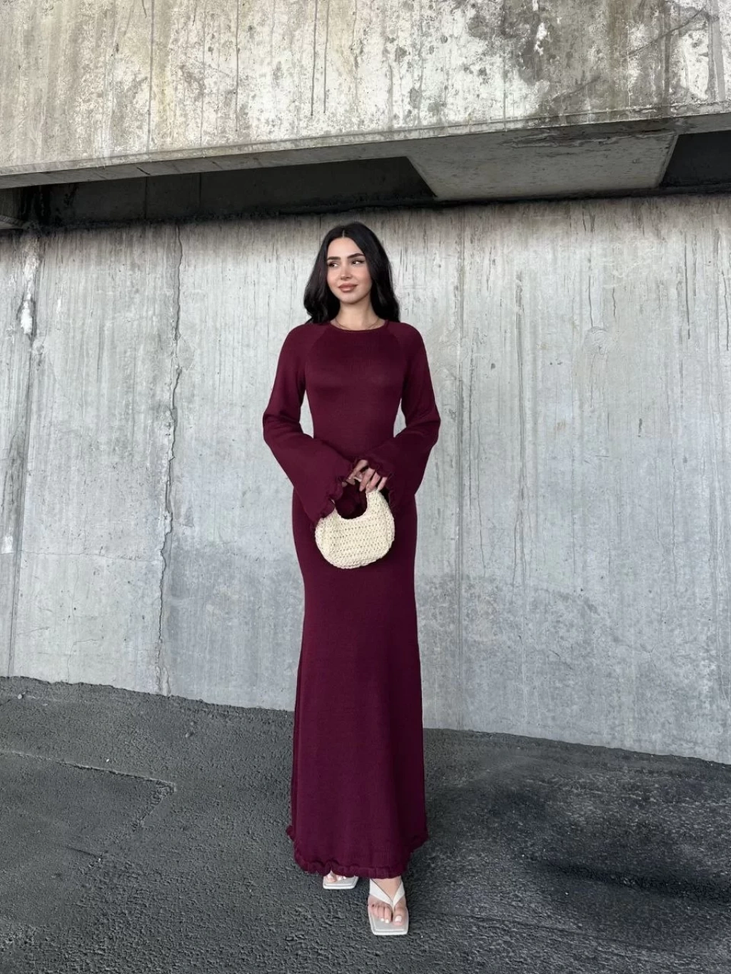 Acık Sırt Detaylı Maxi Uzun Boy Elbise- Bordo