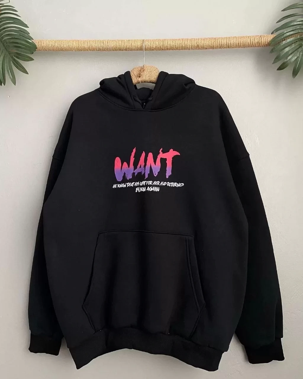 Baskılı Üç İplik Kapüşonlu Oversize Sweatshirt - Siyah