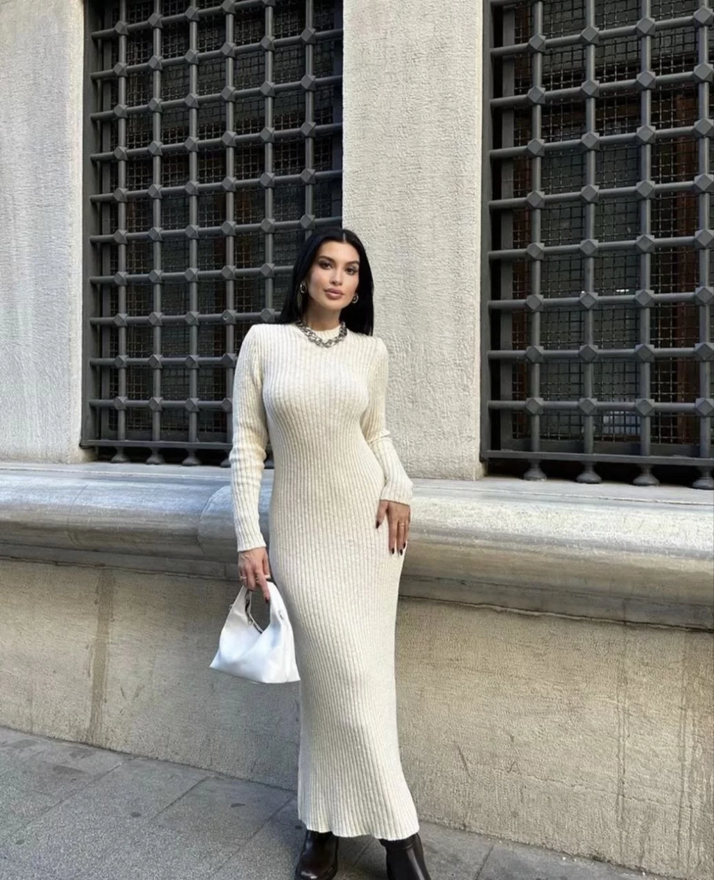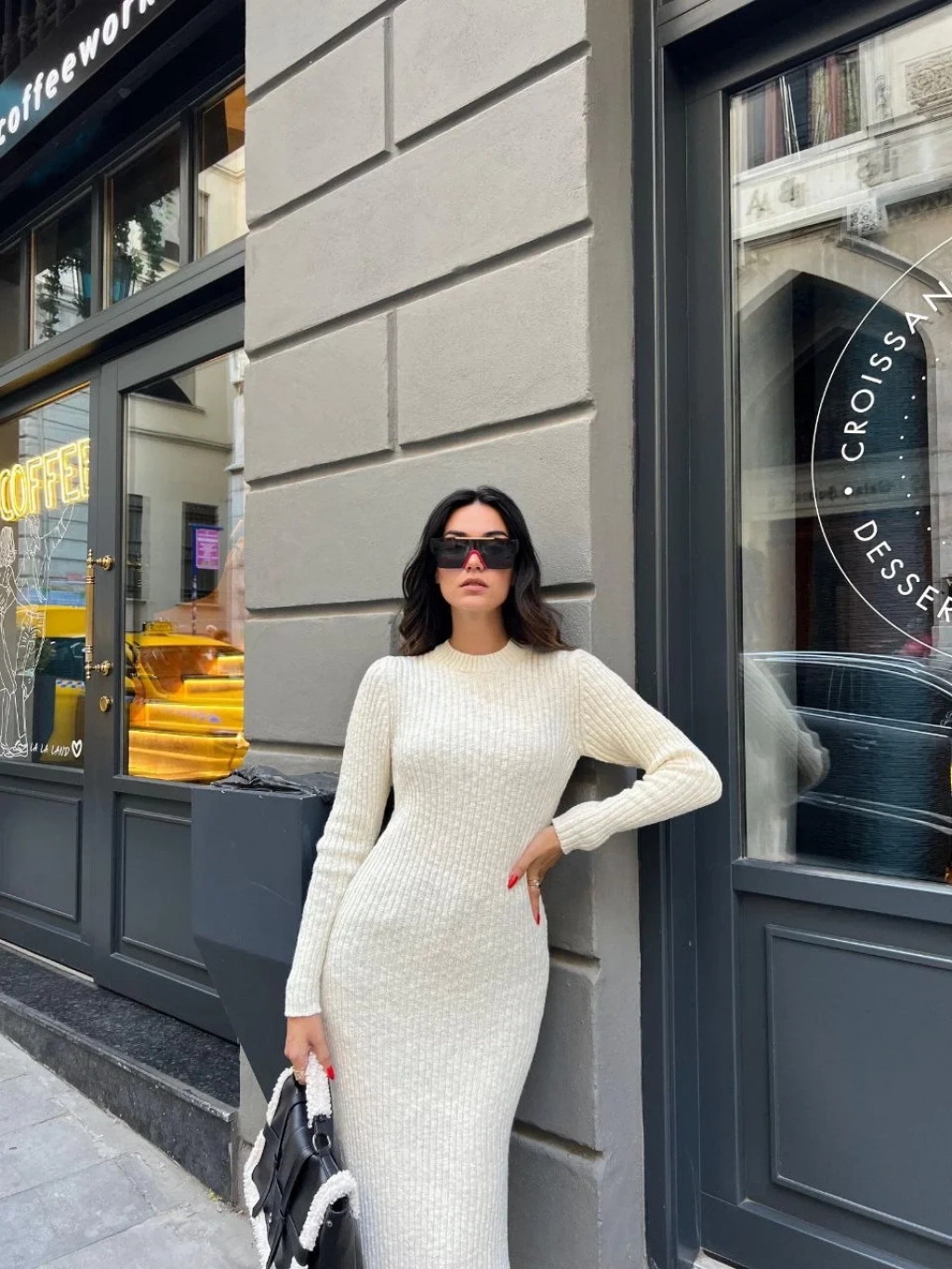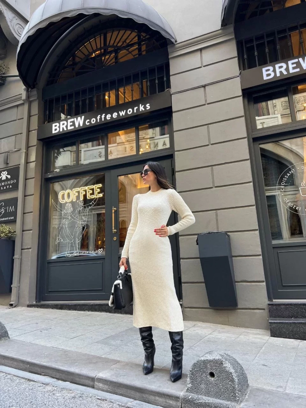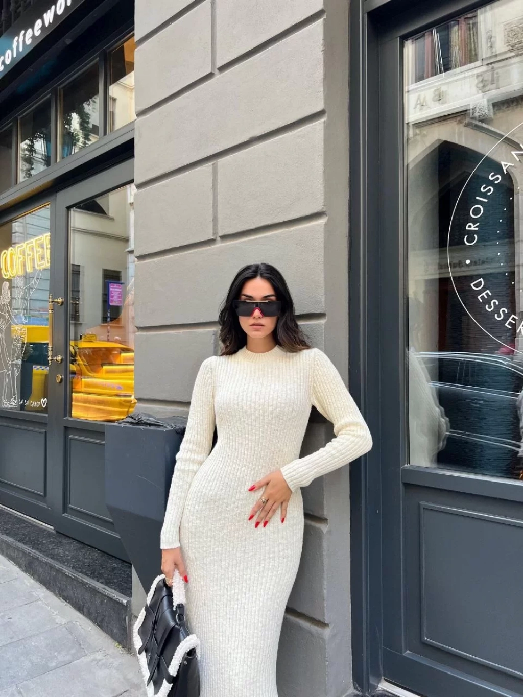 Bisiklet Yaka Fitilli Uzun Elbise - Beyaz