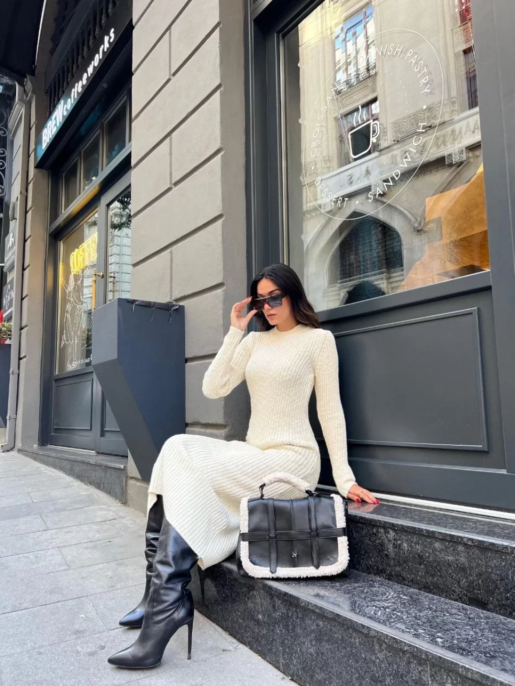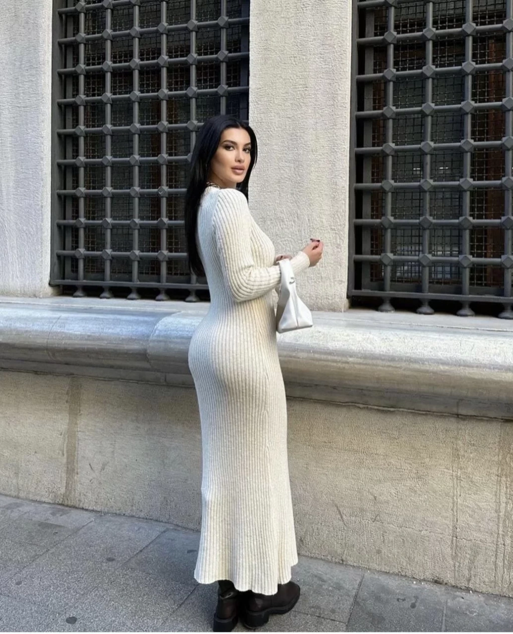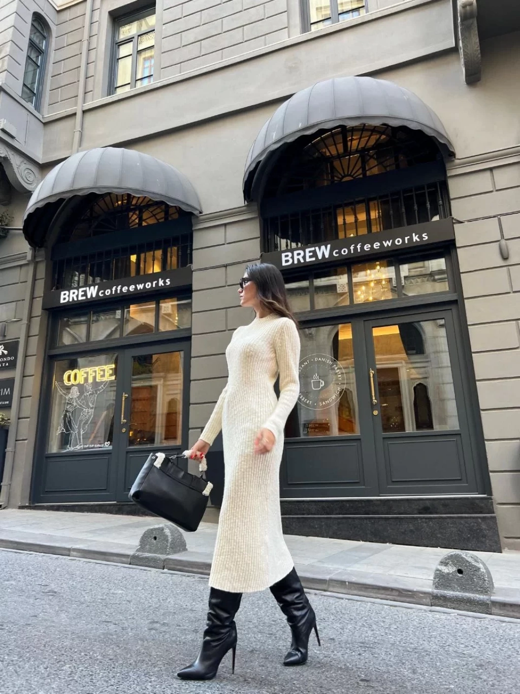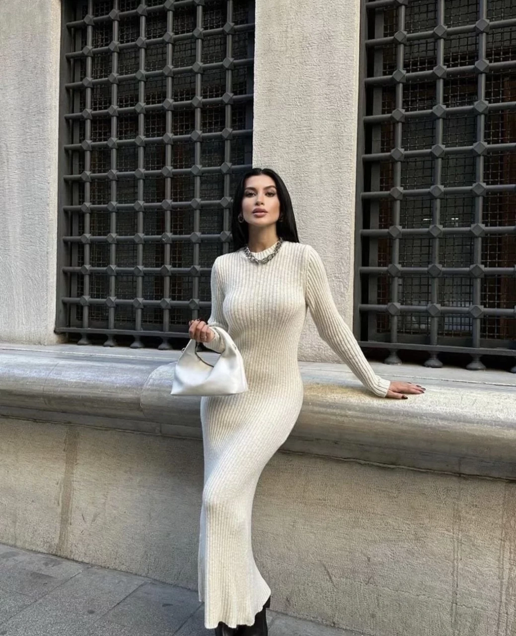 Bisiklet Yaka Fitilli Uzun Elbise - Beyaz