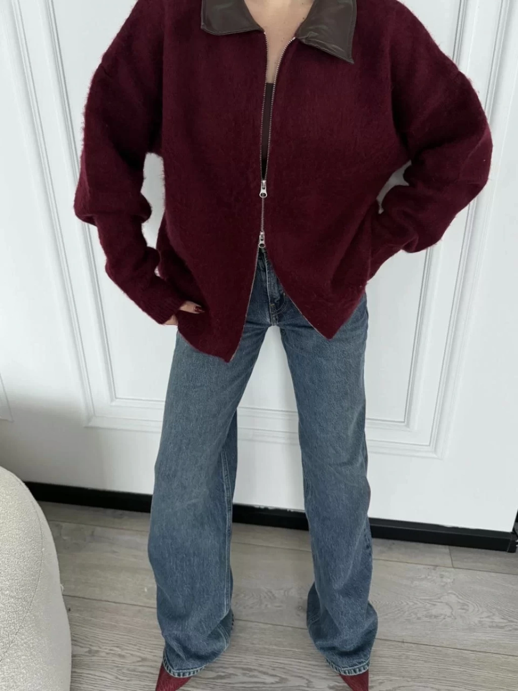 Deri Yakalı Pamuk dokulu Çift Taraflı Çalışan Fermuar Ceket - Bordo