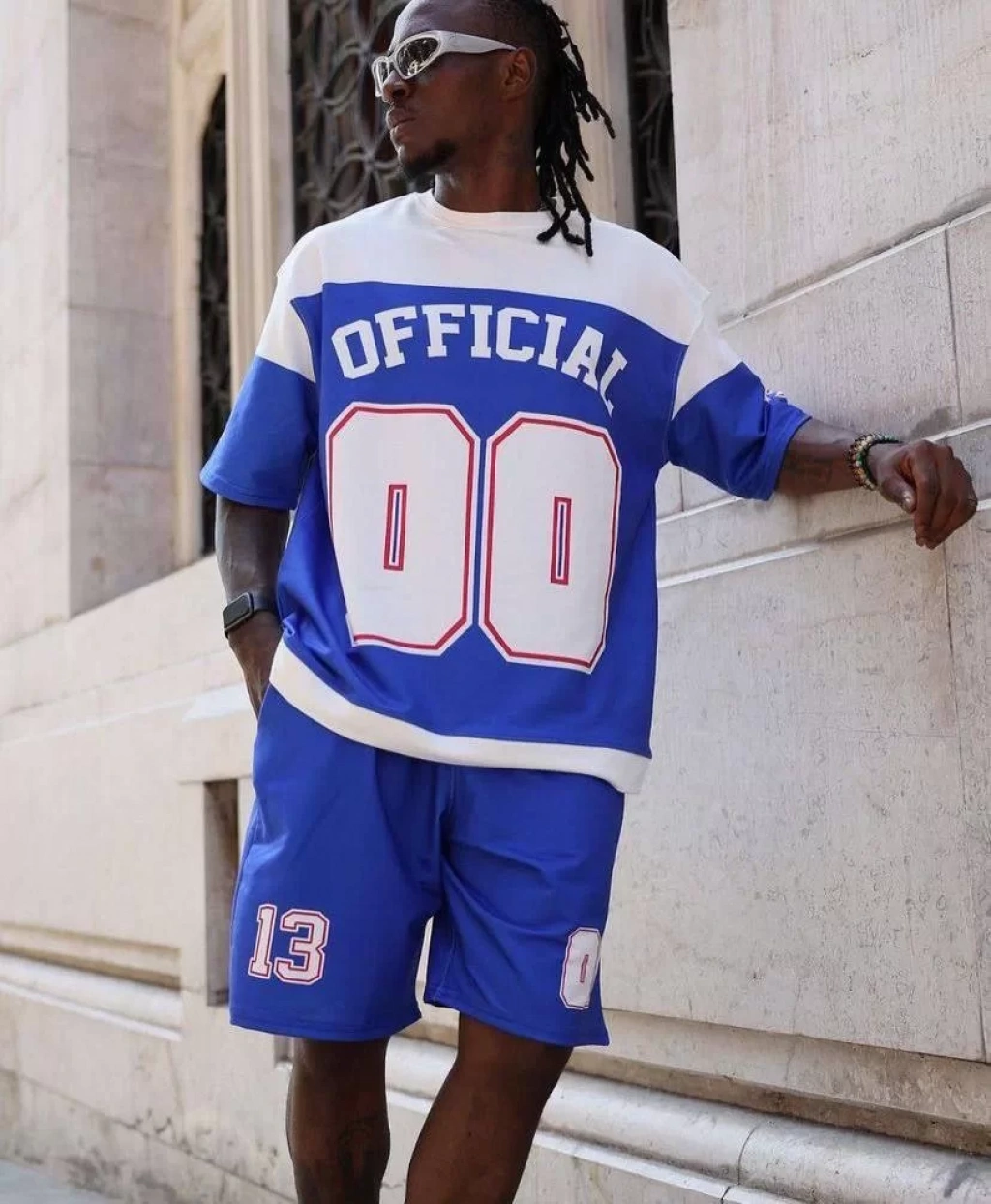 Erkek Şortlu Takım – Oversize İki İplik Kumaş, Ön & Arka Dijital Baskılı Tişört ve Lastikli Cepli Şort, Yazlık Günlük Spor Set - Mavi
