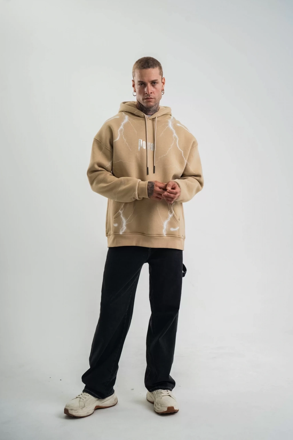 Double Oversize Kapşonlu Şimşek Pano Baskılı SweatShirt - Bej