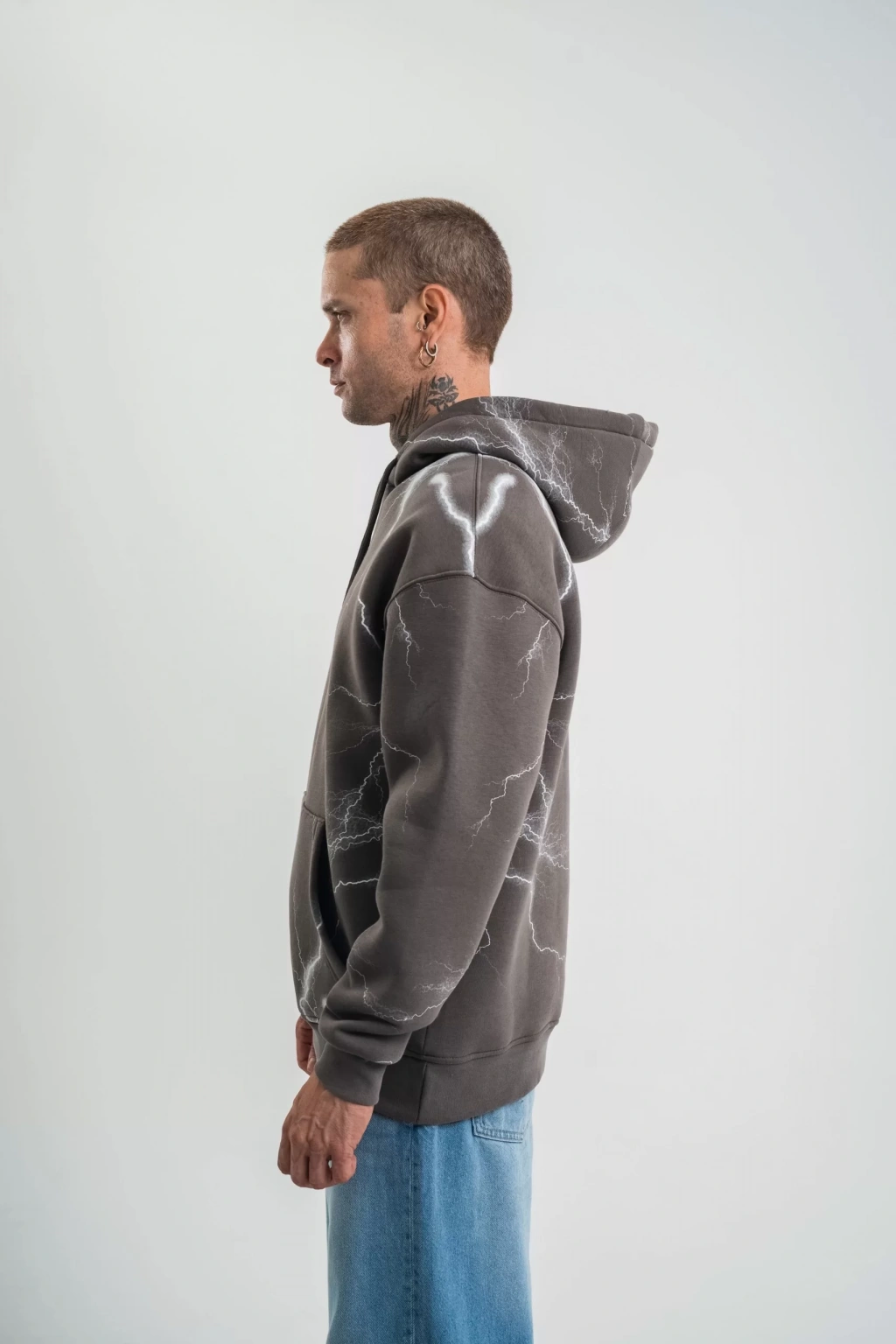 Double Oversize Kapşonlu Şimşek Pano Baskılı SweatShirt - Füme
