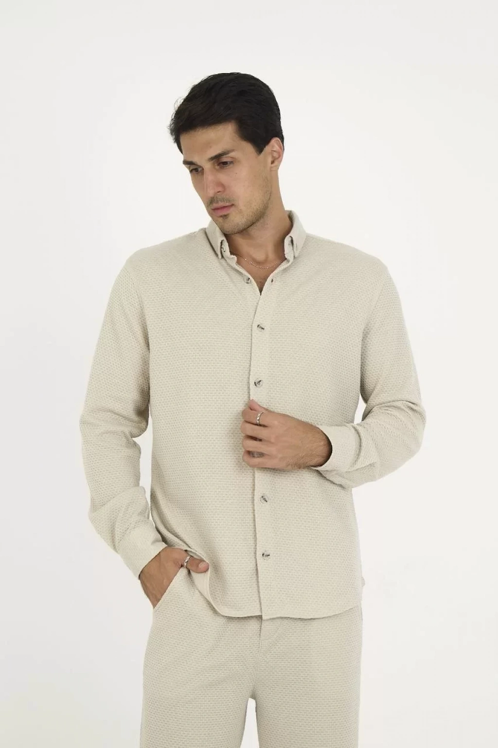 Düğmeli Tam Kalıp Uzun Kol Jakar Gömlek - Gri