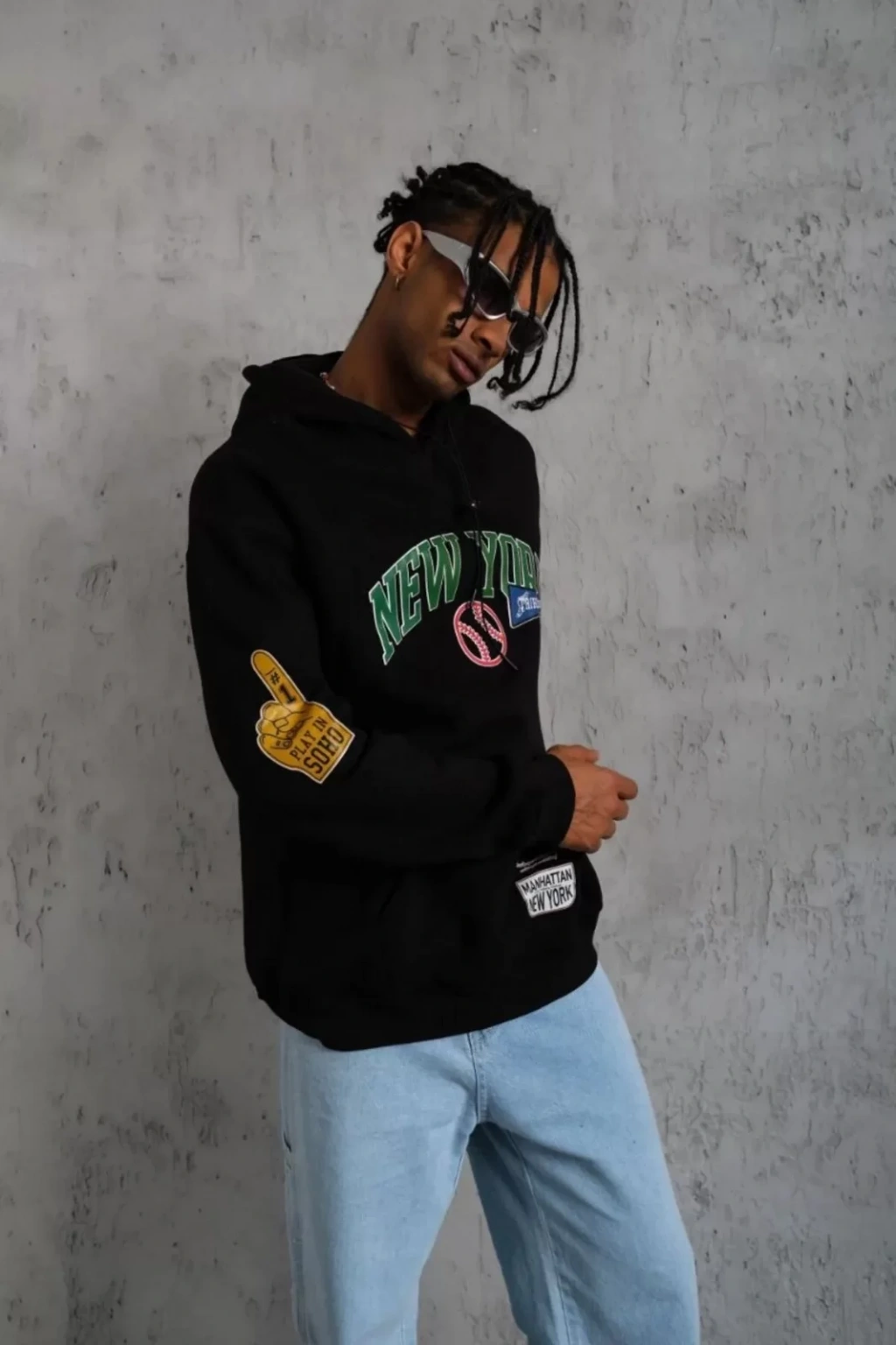 Erkek Baskılı Kapüşonlu Sweatshirt - Siyah