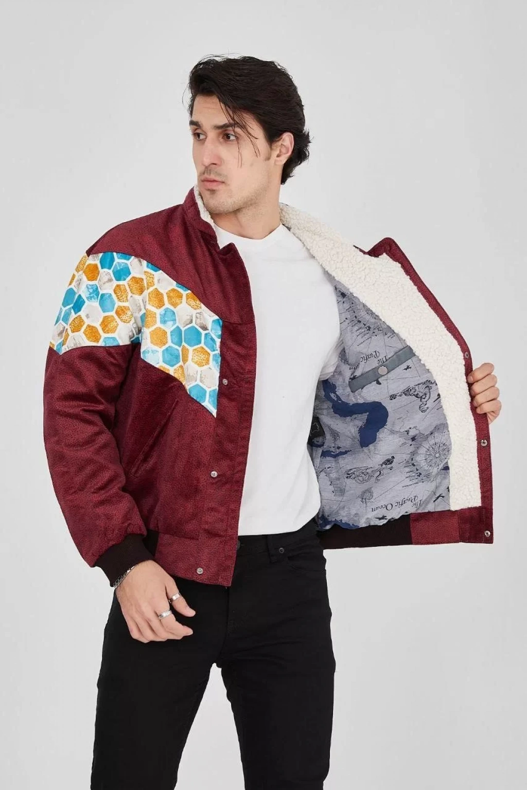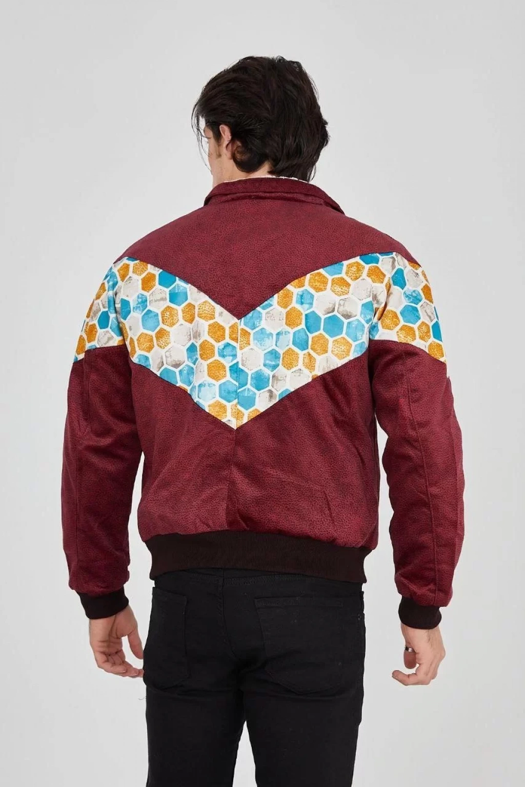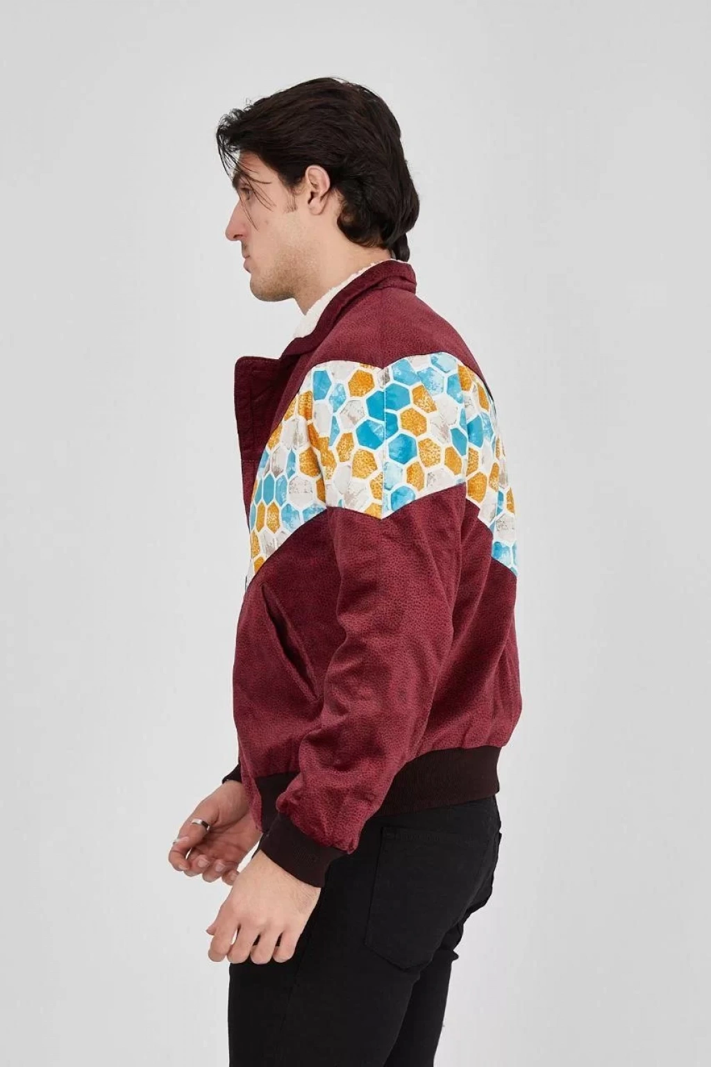 Erkek İçi Astarlı İçten Yaka Kısmı Peluşlu Beyaz Şeritli Vintage Ceket - Mürdüm