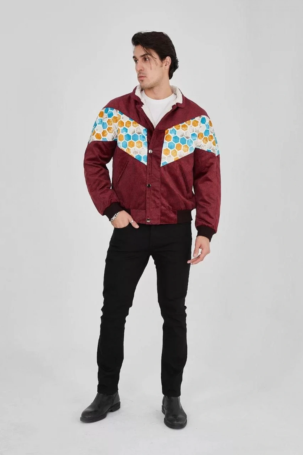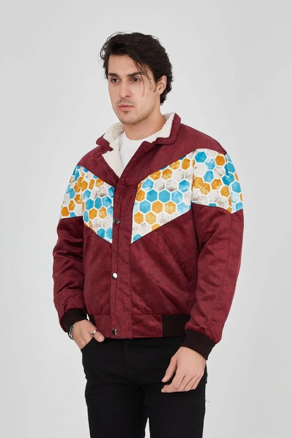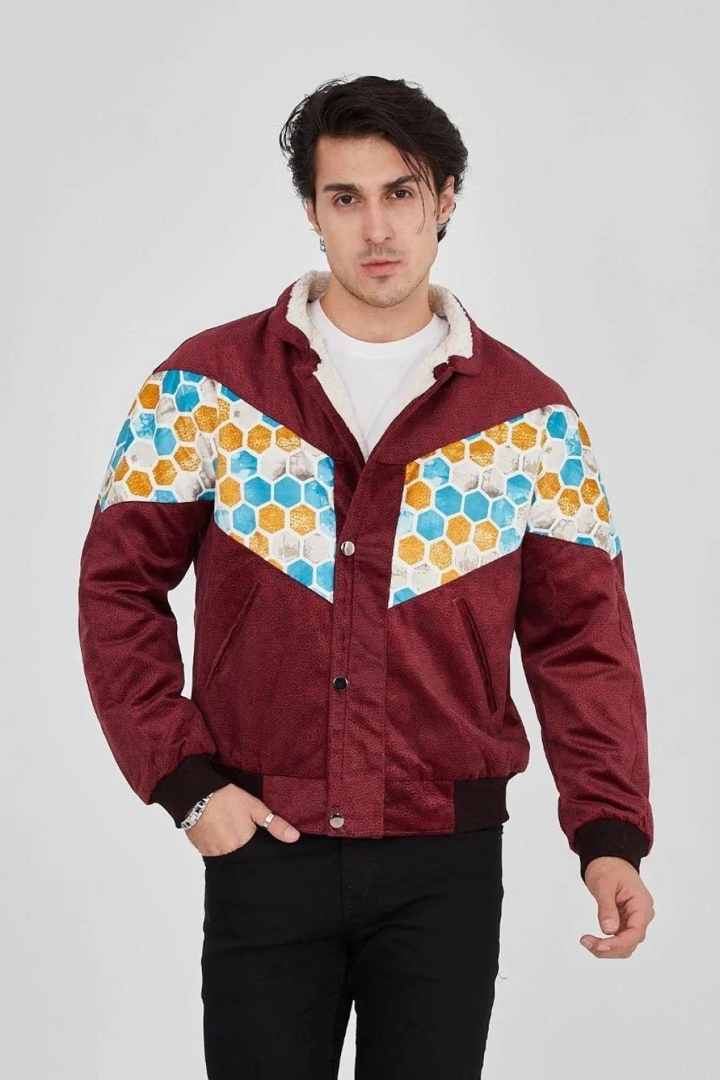 Erkek İçi Astarlı İçten Yaka Kısmı Peluşlu Beyaz Şeritli Vintage Ceket - Mürdüm