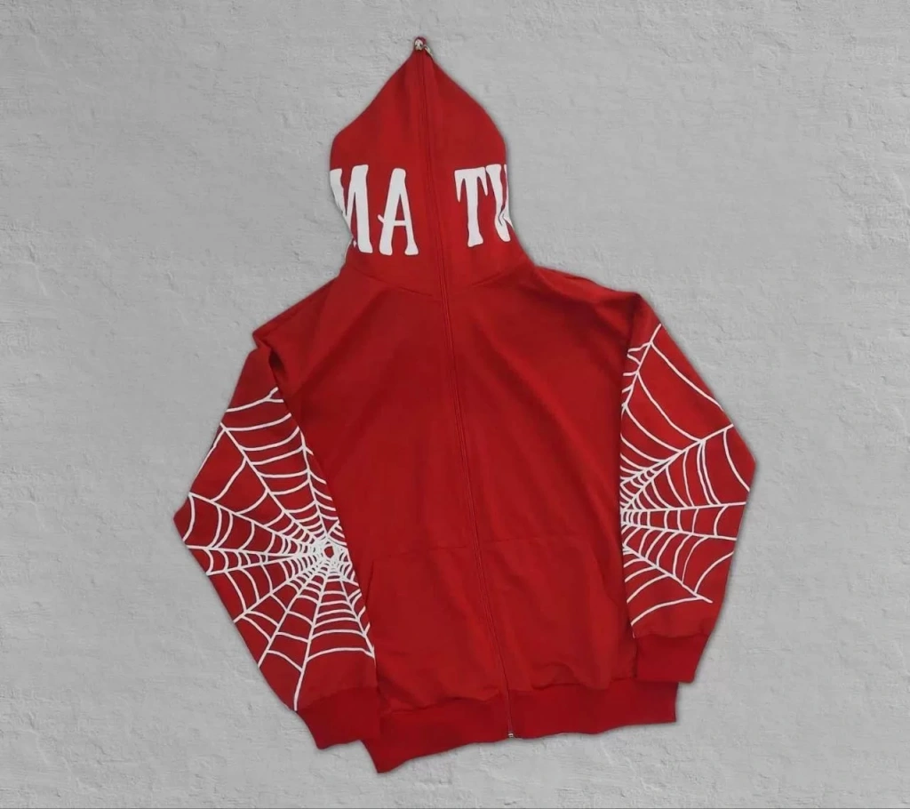 Erkek İki İplik Örümcek Baskılı Oversize Hırka - Kırmızı