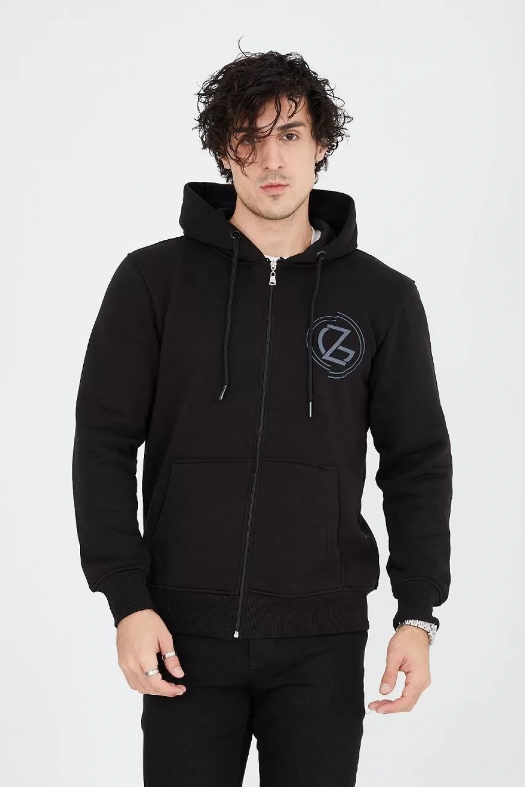 Erkek Kapüşonlu Baskılı Fermuarlı Hırka - Siyah
