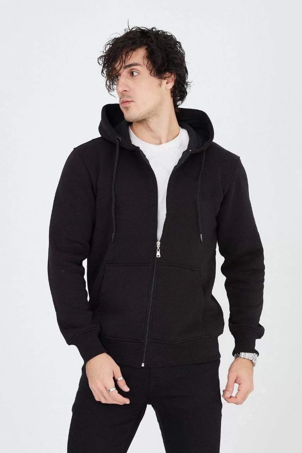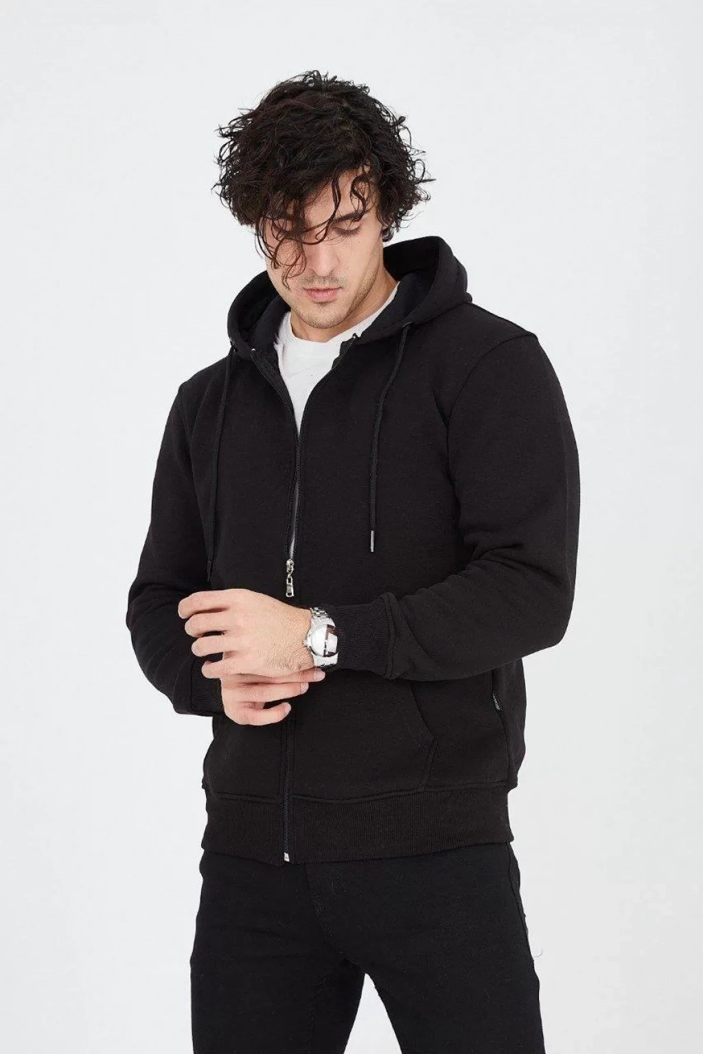 Erkek Kapüşonlu Düz Fermuarlı Hırka - Siyah