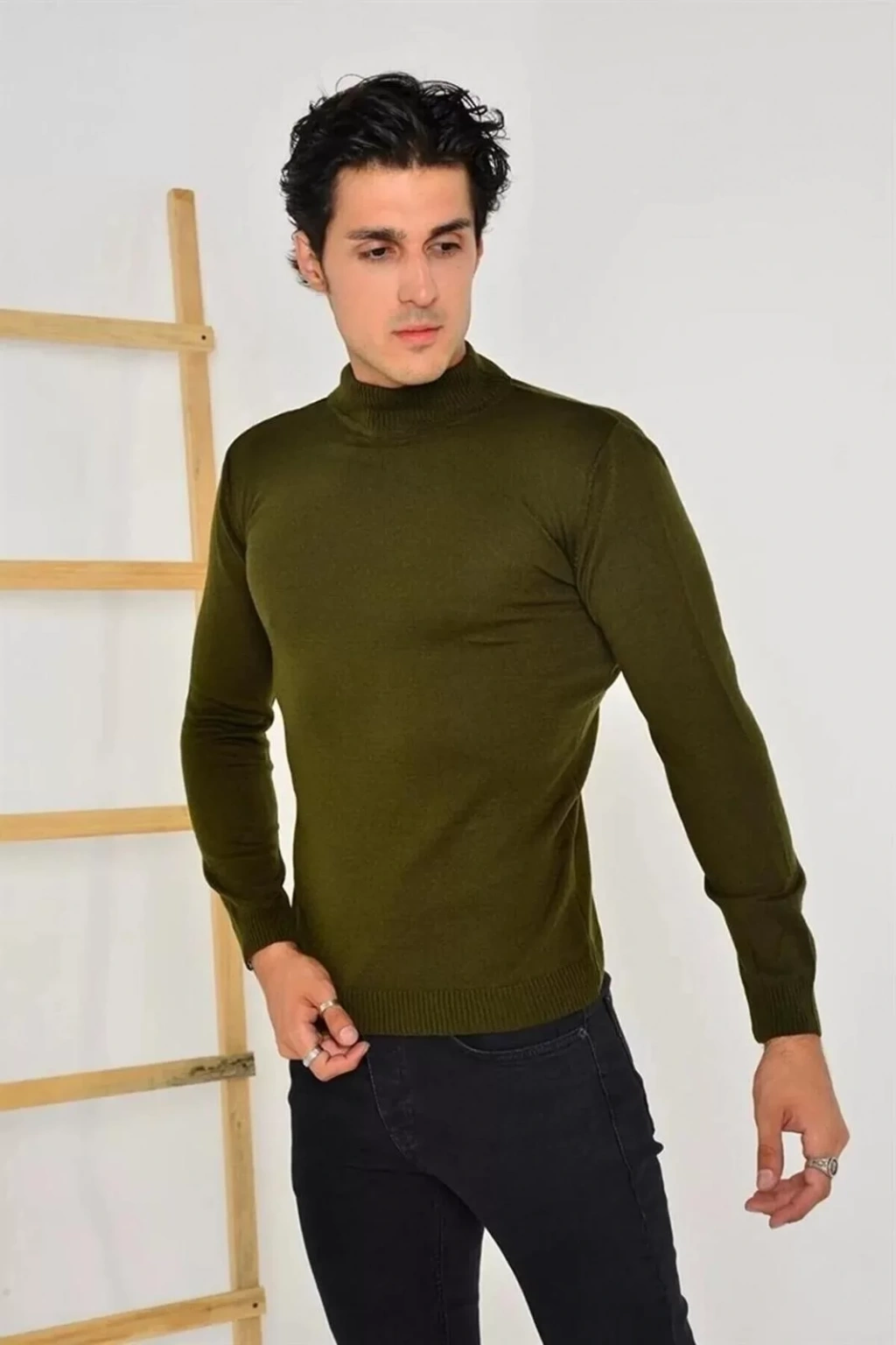 Erkek Tam Balıkçı Yaka Düz Renk Kazak - Yeşil