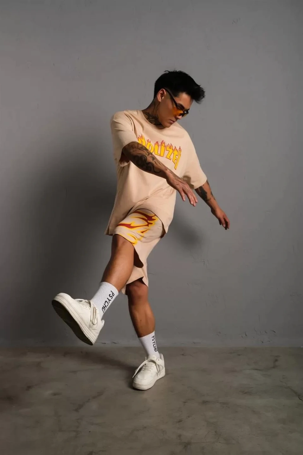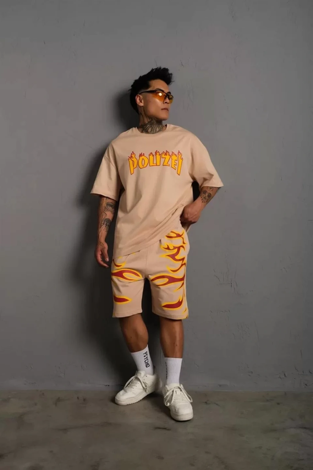 Erkek Alev Baskılı İkili Şortlu Takım - Bej
