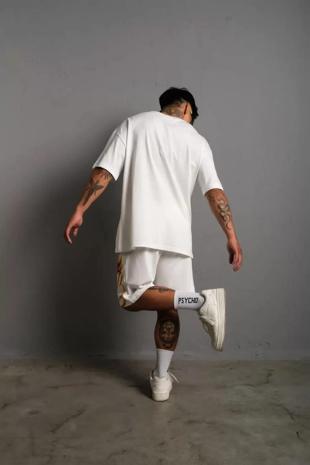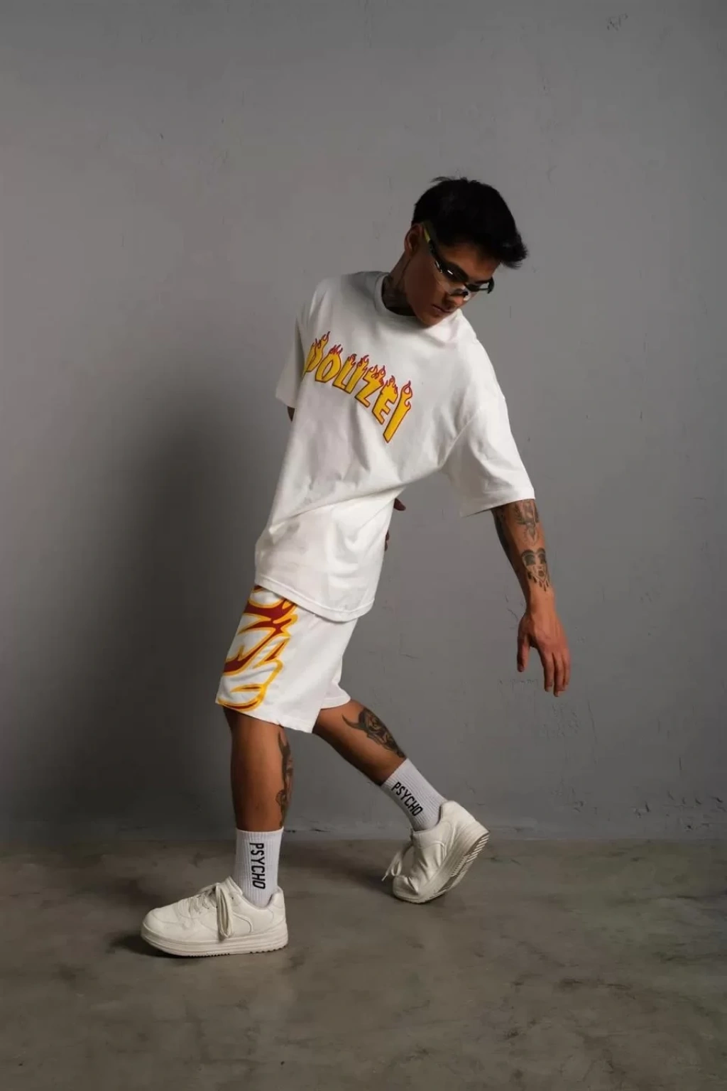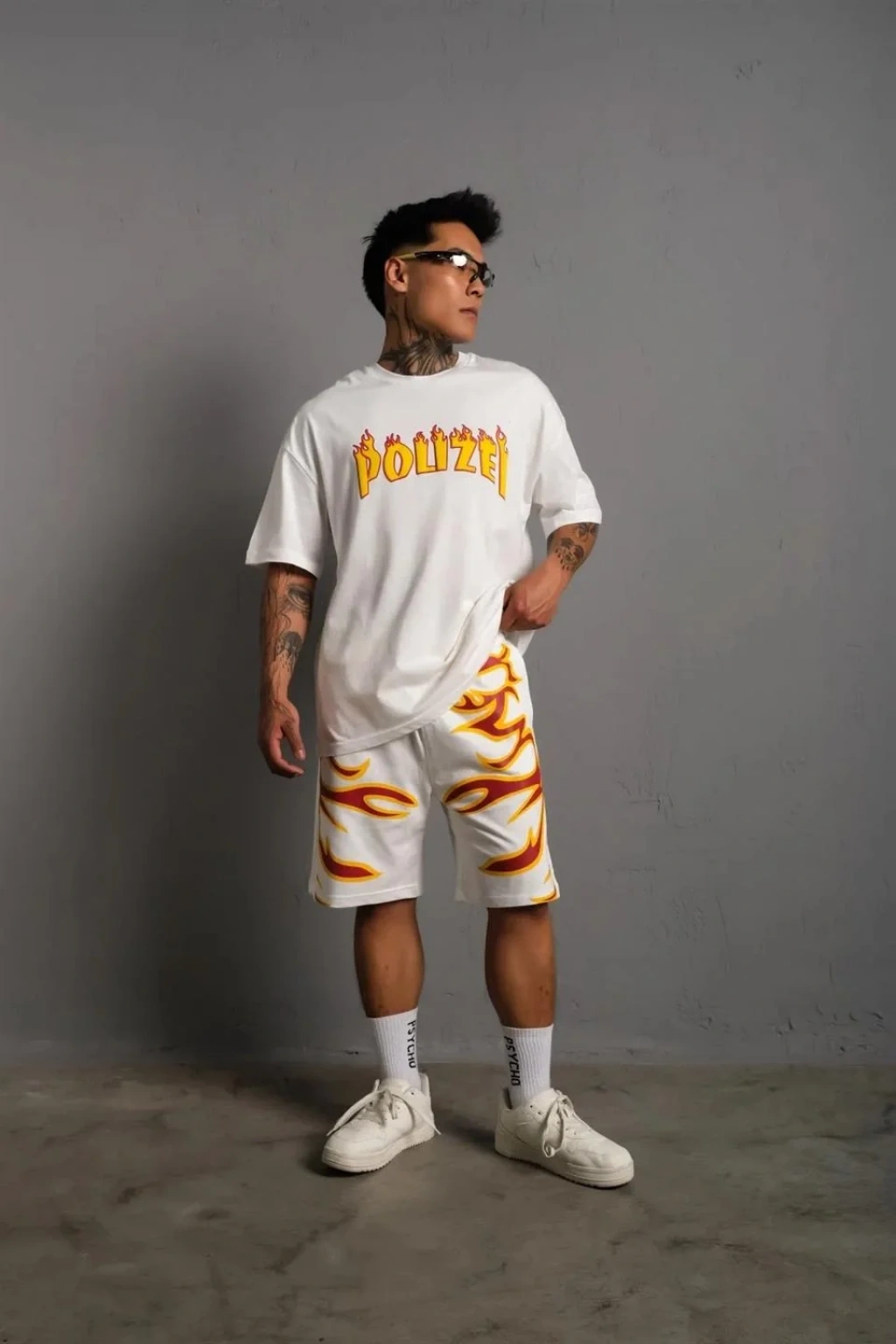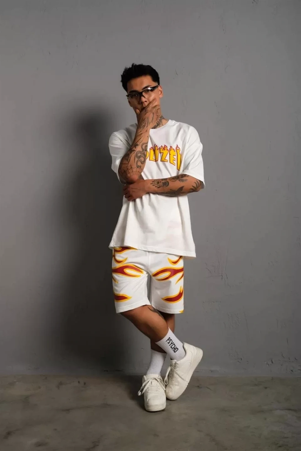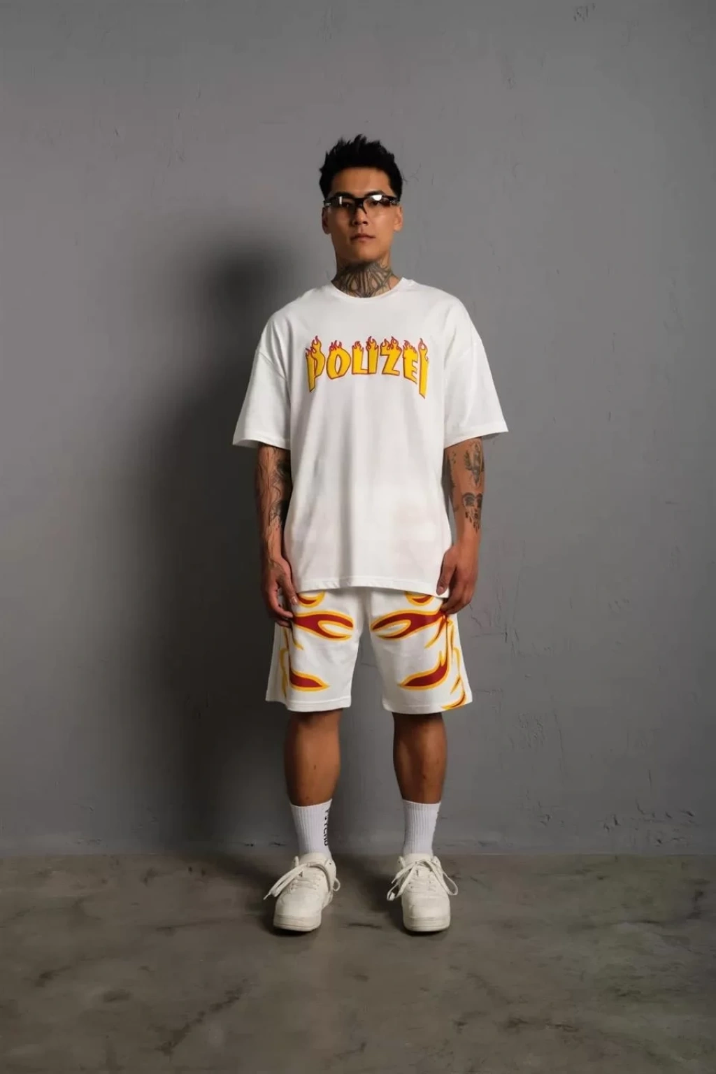 Erkek Alev Baskılı İkili Şortlu Takım - Beyaz