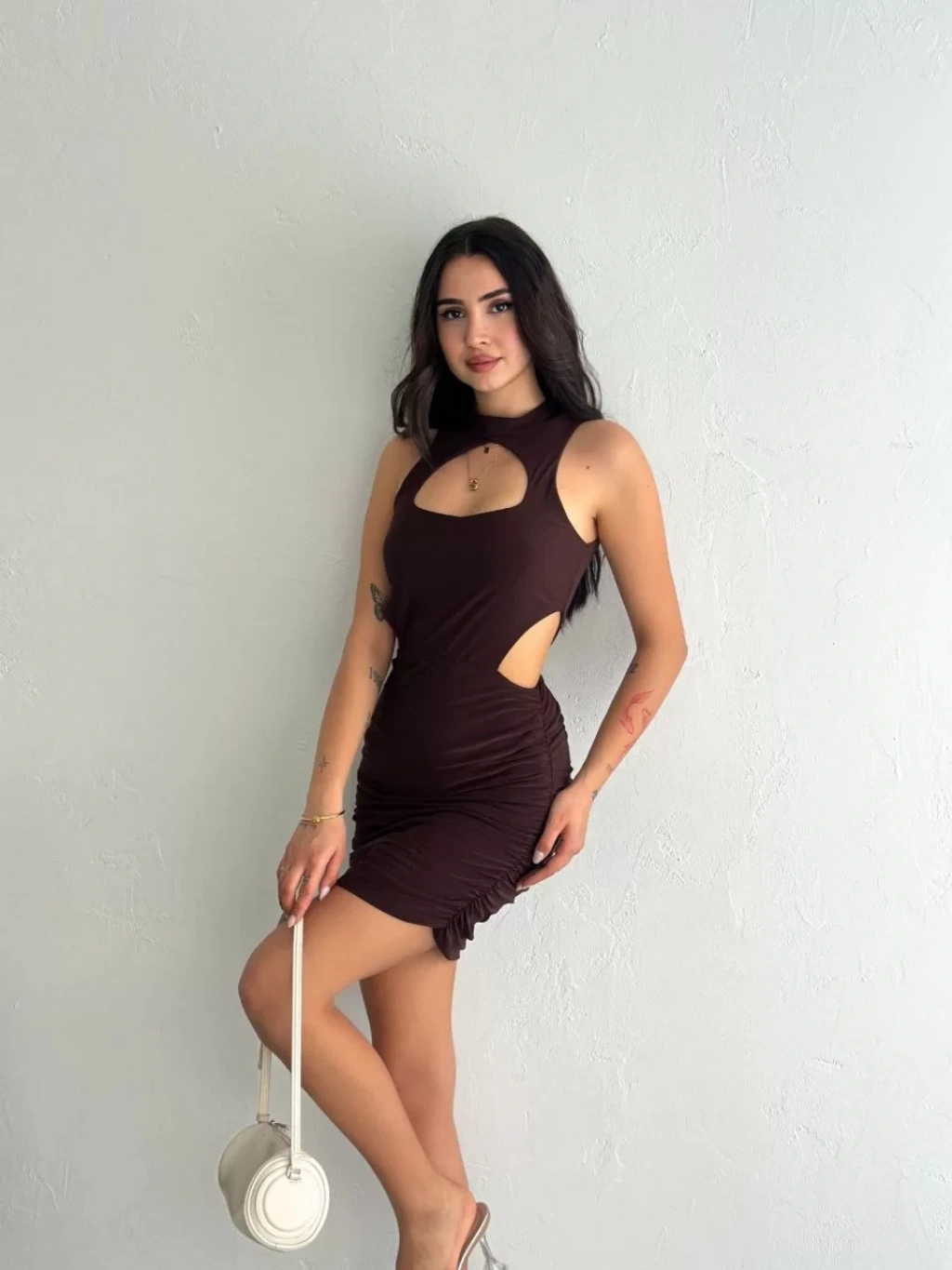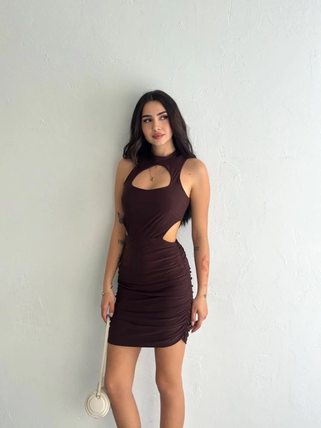 Göğüs ve Yanlar dekolteli Kolsuz Boy Elbise - Kahverengi