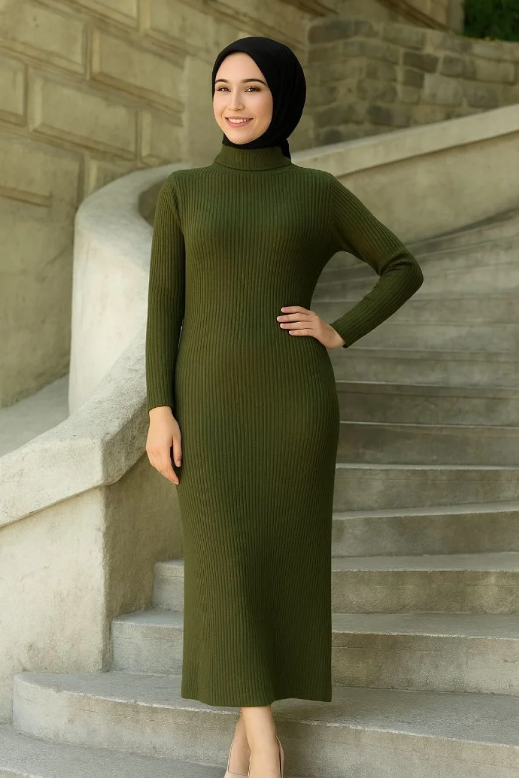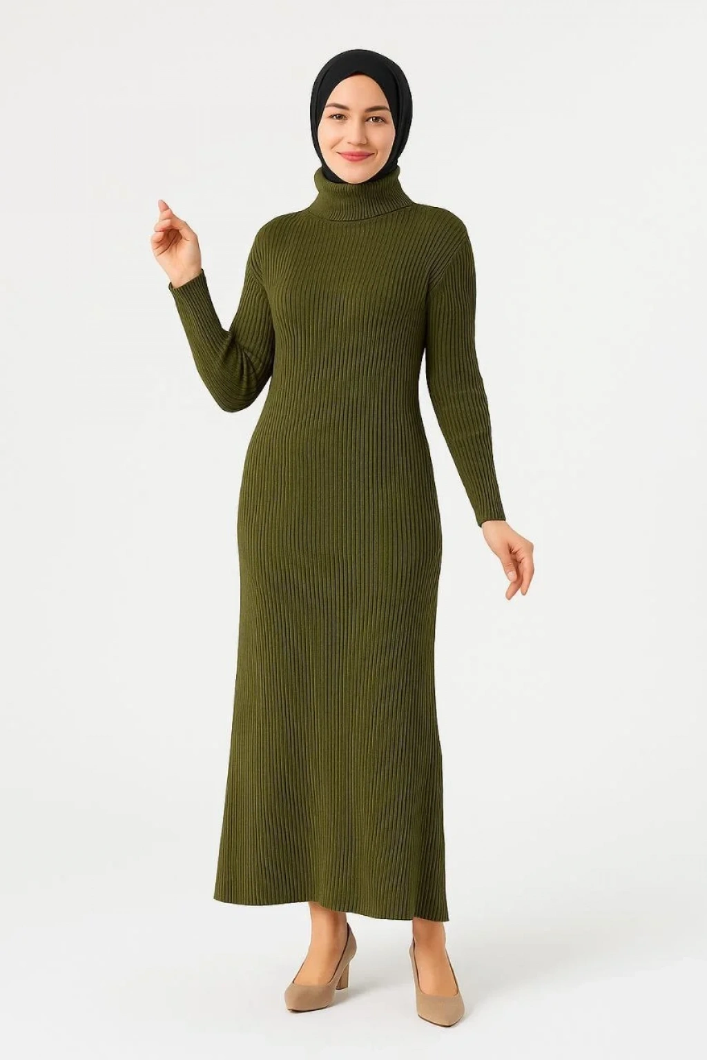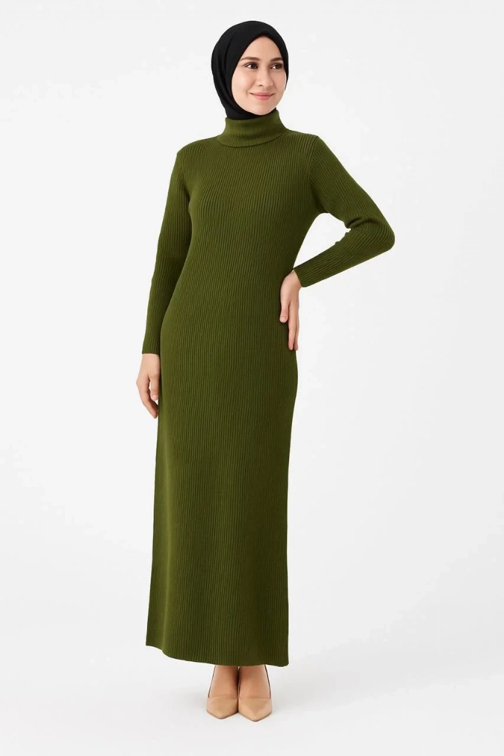 Kadın Tesettür Triko Elbise – Boğazlı Uzun Fitilli Dokuma, Esnek Tam Kalıp, 130 cm Midi Boy, Bahar & Kış Şık Rahat Stil - Haki