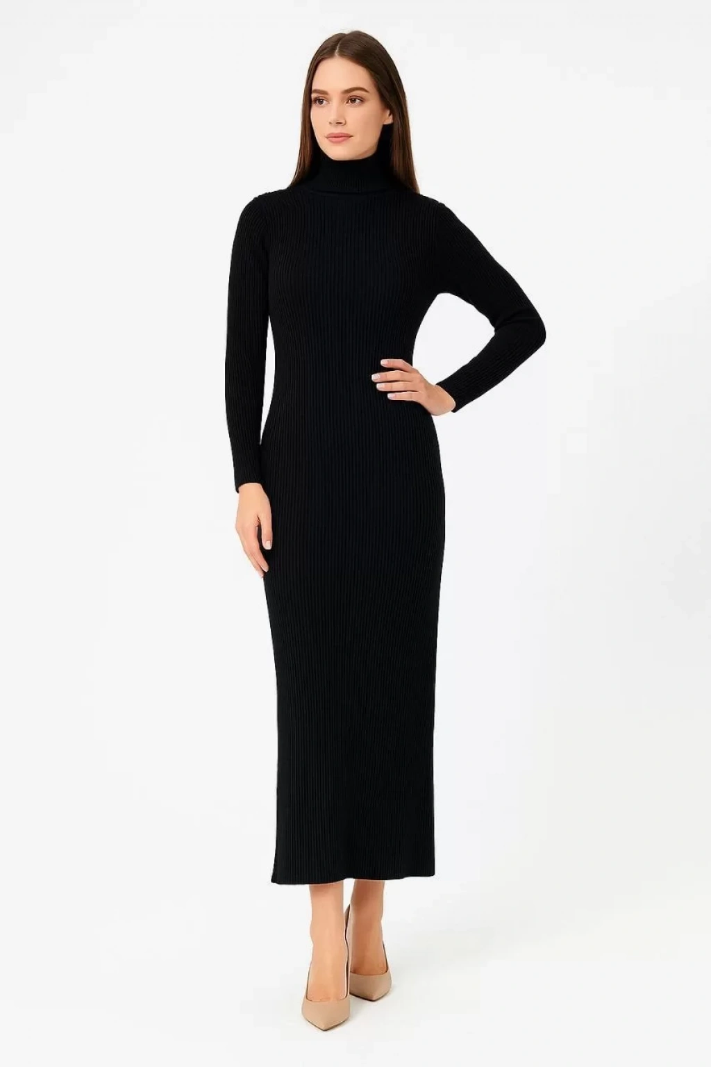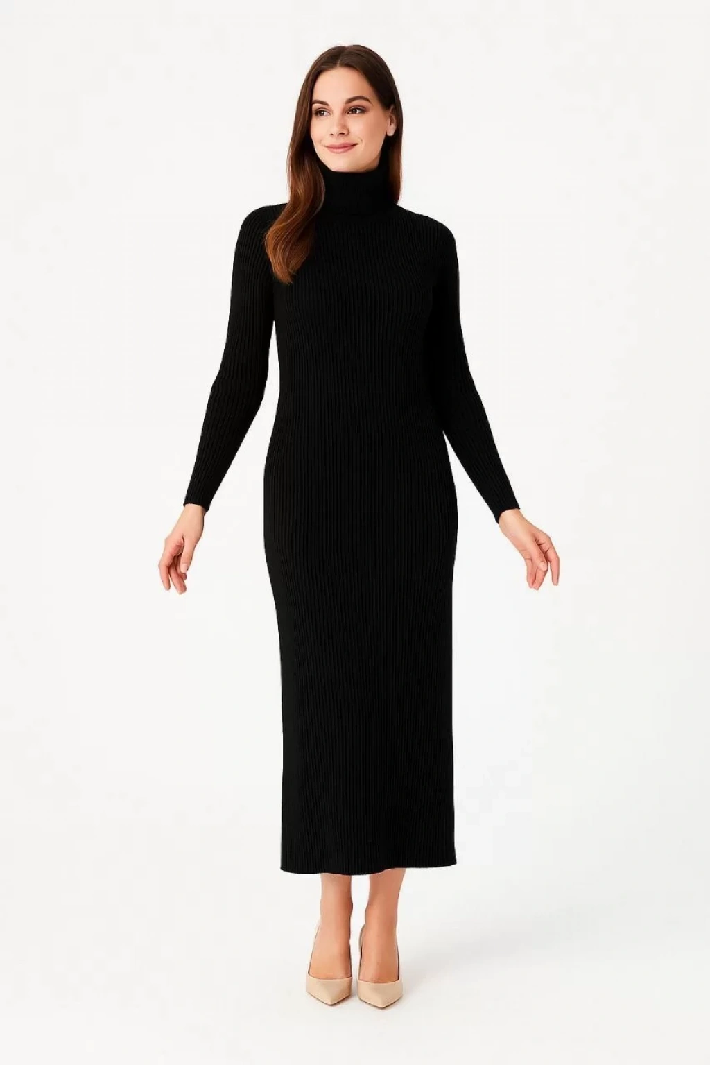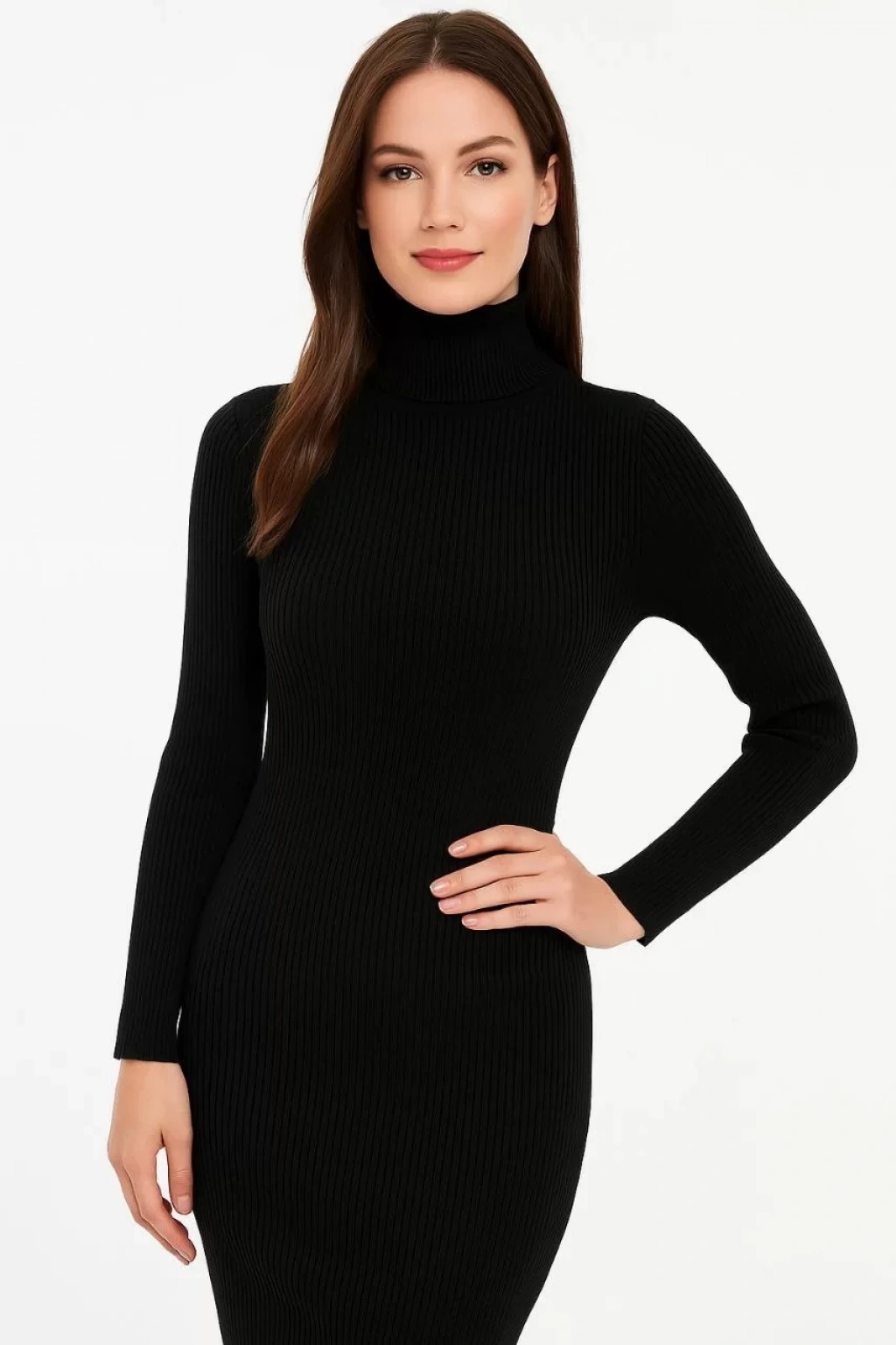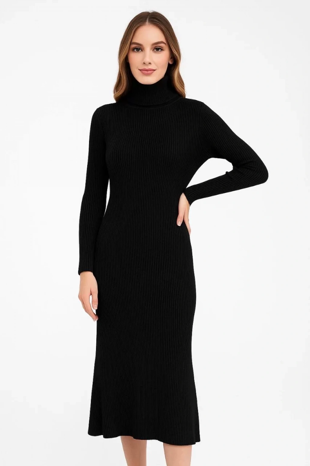 Kadın Boğazlı Triko Elbise – Uzun Fitilli Esnek Dokuma, Tam Kalıp, Kışlık & Baharlık Şık Rahat Stil, 130 cm Midi Boy Elbise - Siyah