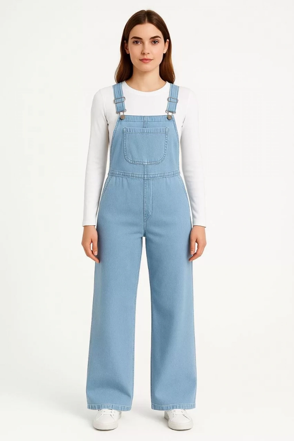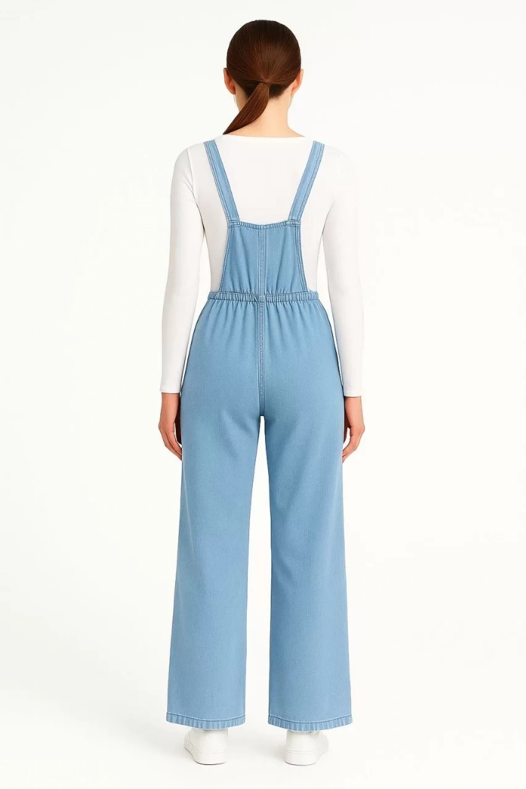 Sezon4 mevsimKadın Chambray Açık Mavi Denim Görünümlü Geniş Paça Salopet Tulum