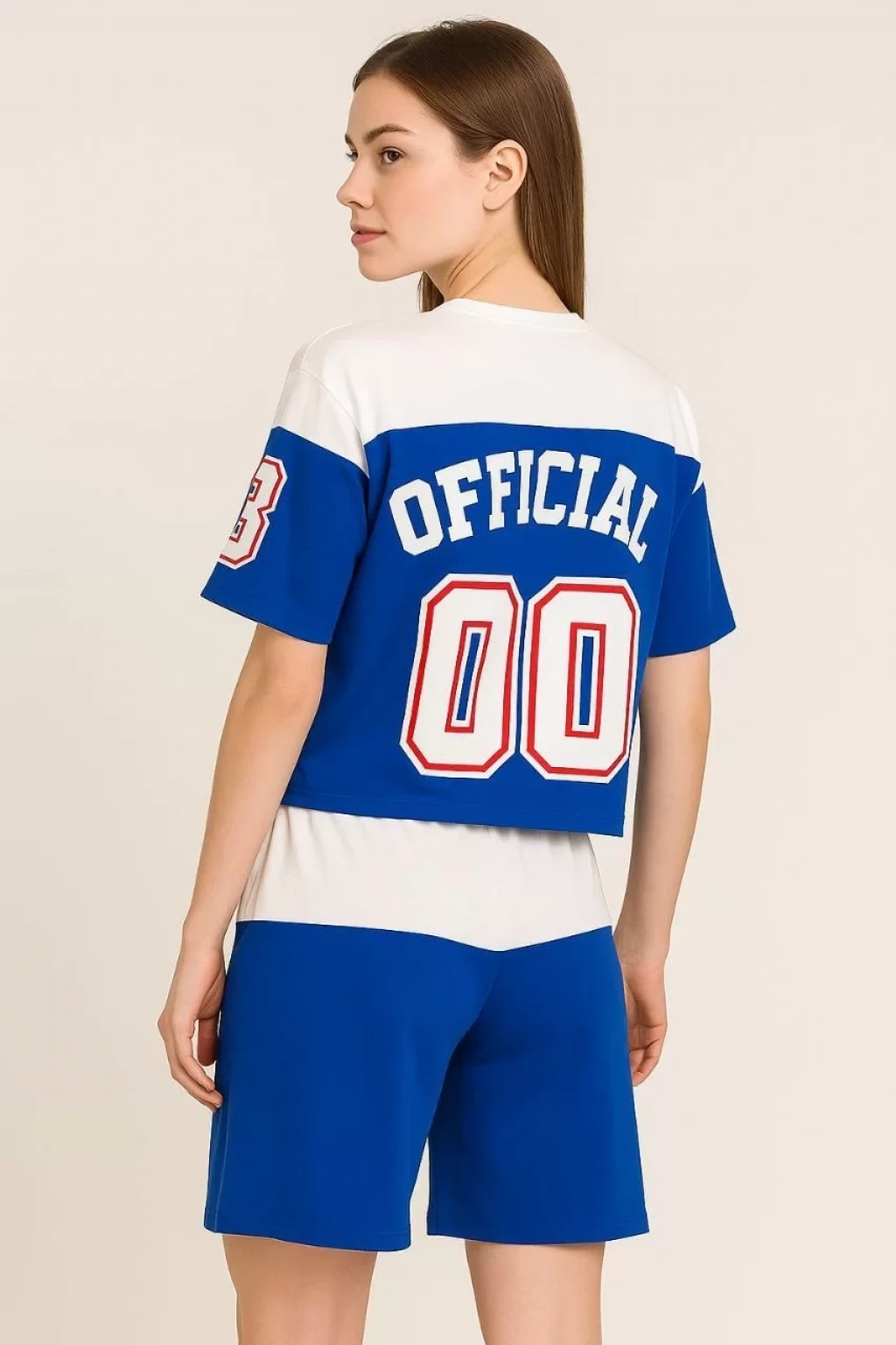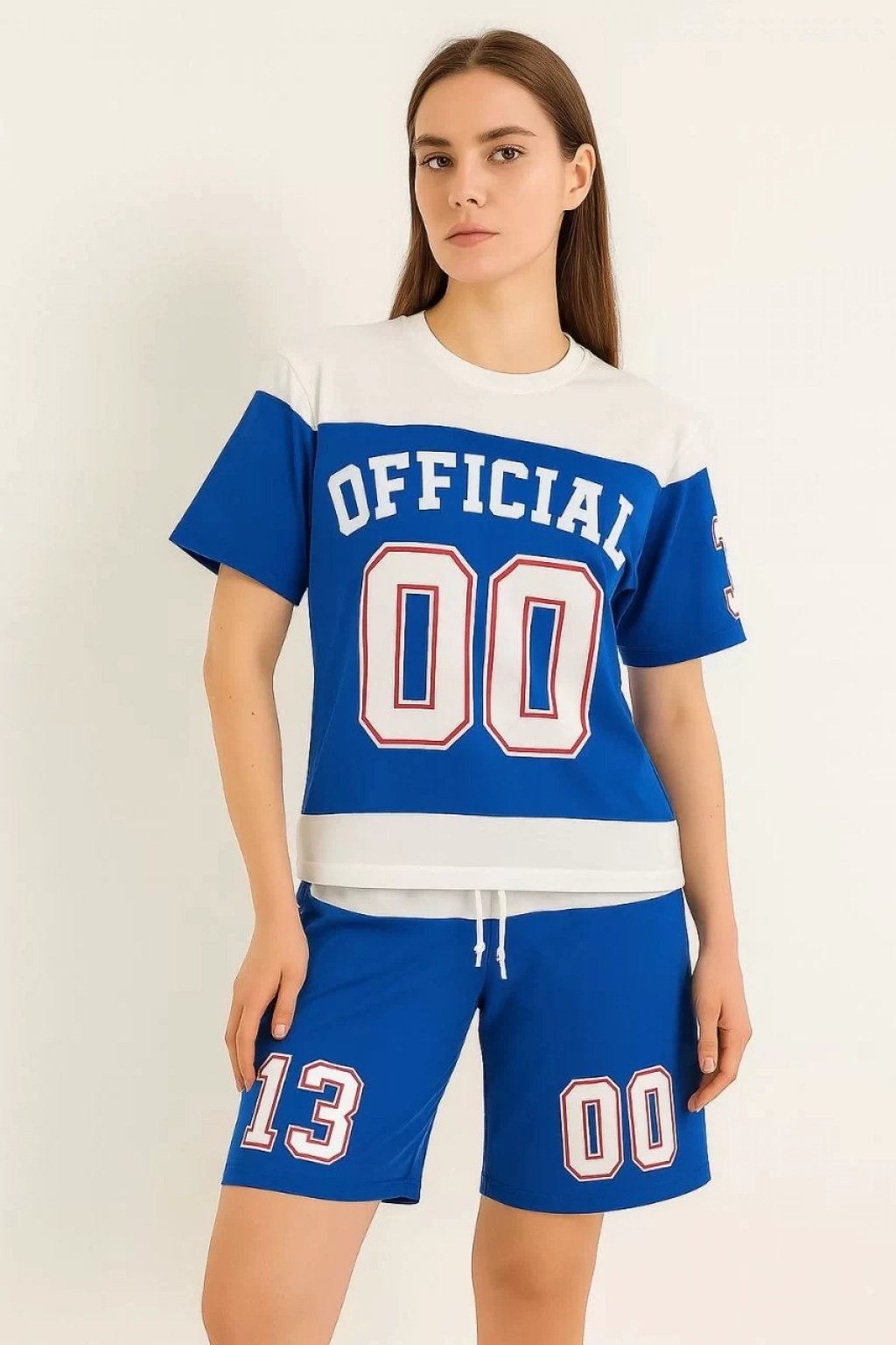 Kadın Şortlu Takım – Oversize İki İplik Kumaş, Ön & Arka Dijital Baskılı Tişört ve Lastikli Cepli Şort, Yazlık Günlük Spor Set - Mavi