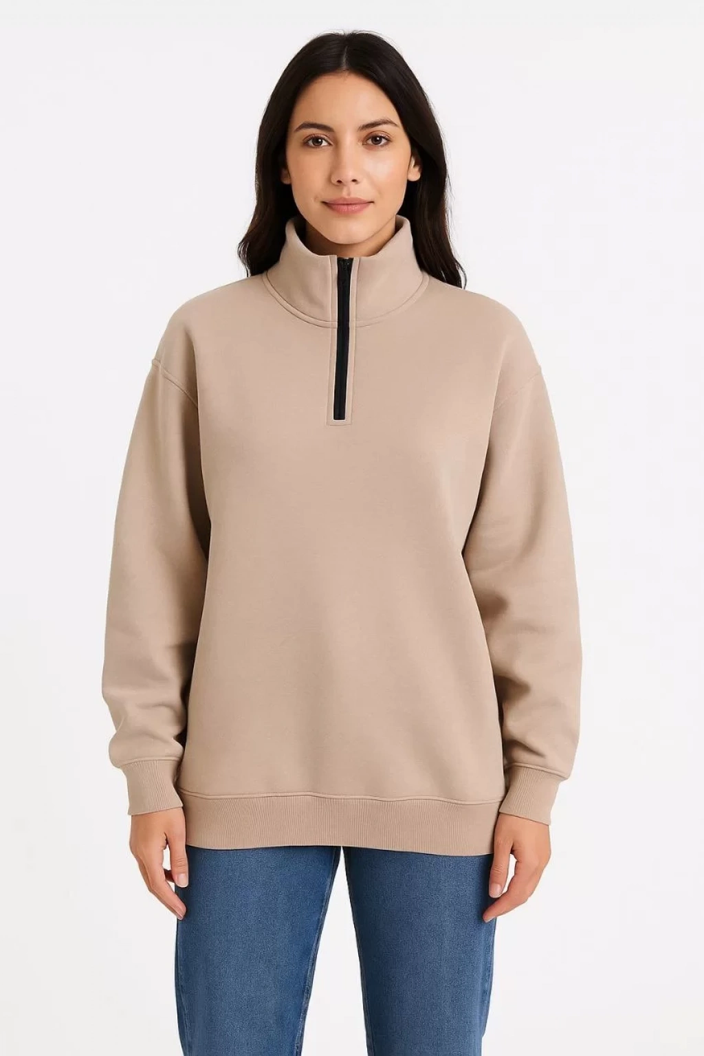 Kadın Üç İplik Dık Yaka Yarım Fermuarlı SweatShirt - Bej