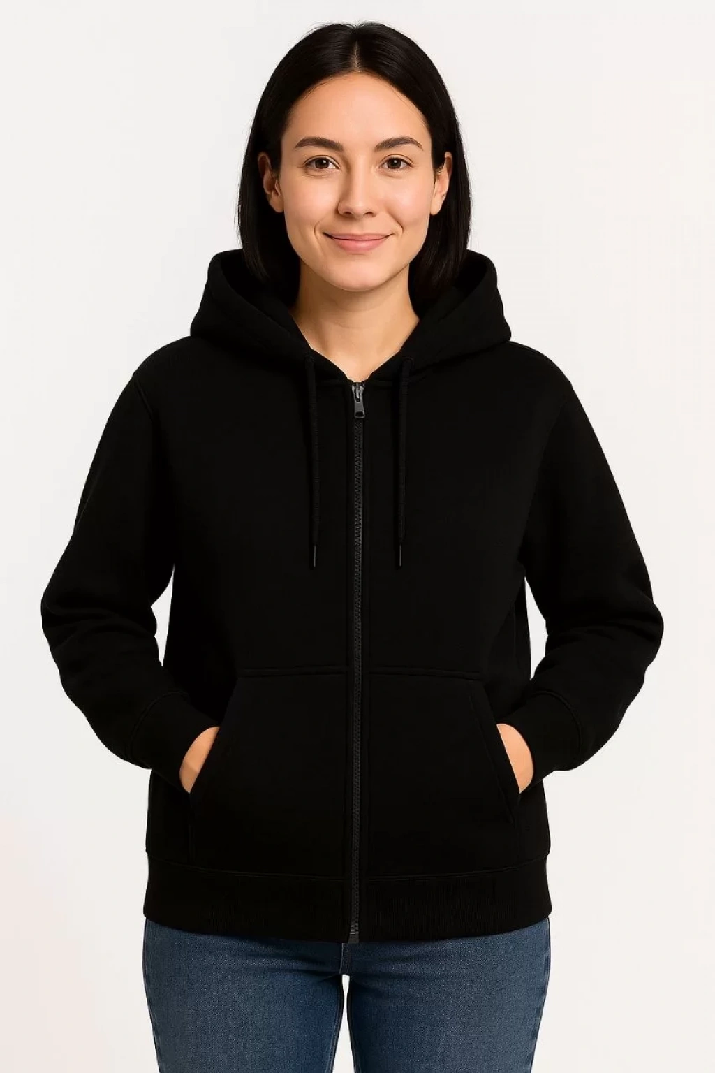 Kadın Üç İplik Kapüşonlu Tam Fermuarlı Kanguru Çepli SweatShirt Hoodie - Siyah