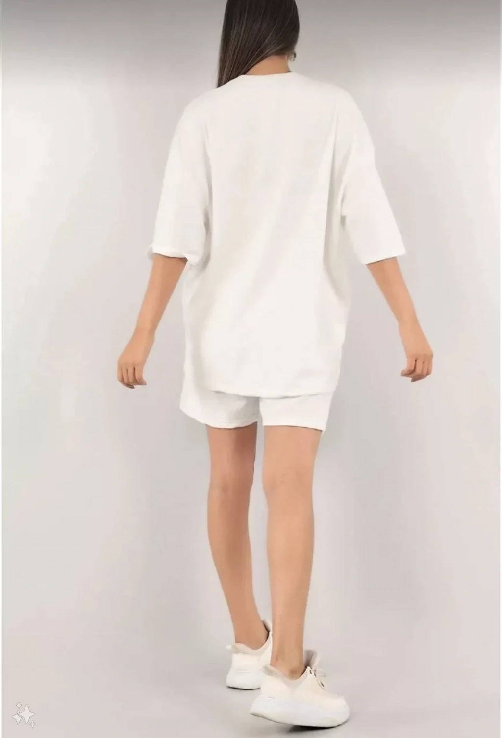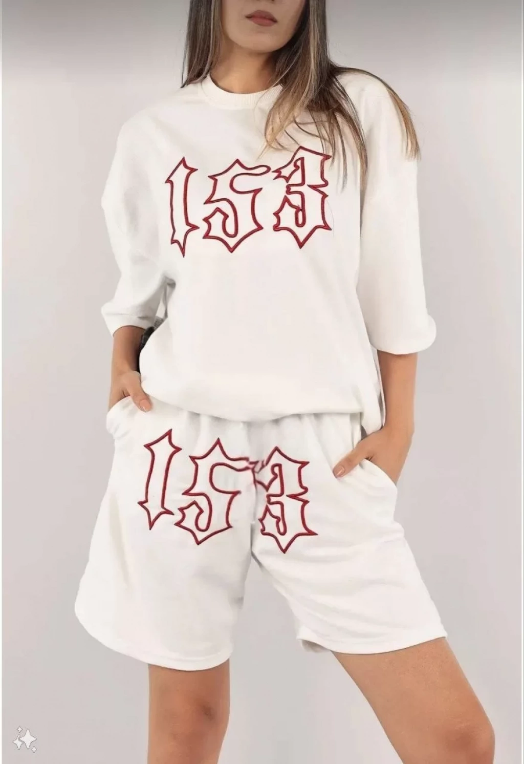 Kadın Unisex Nakış İşlemeli Şort Takım - Beyaz