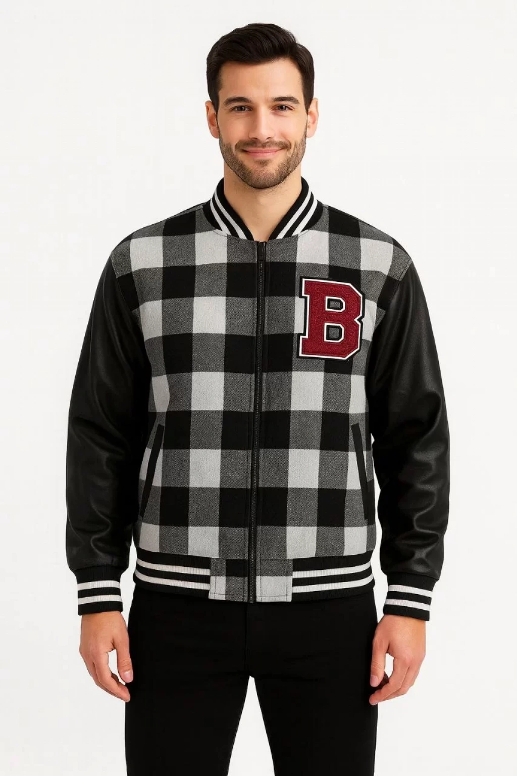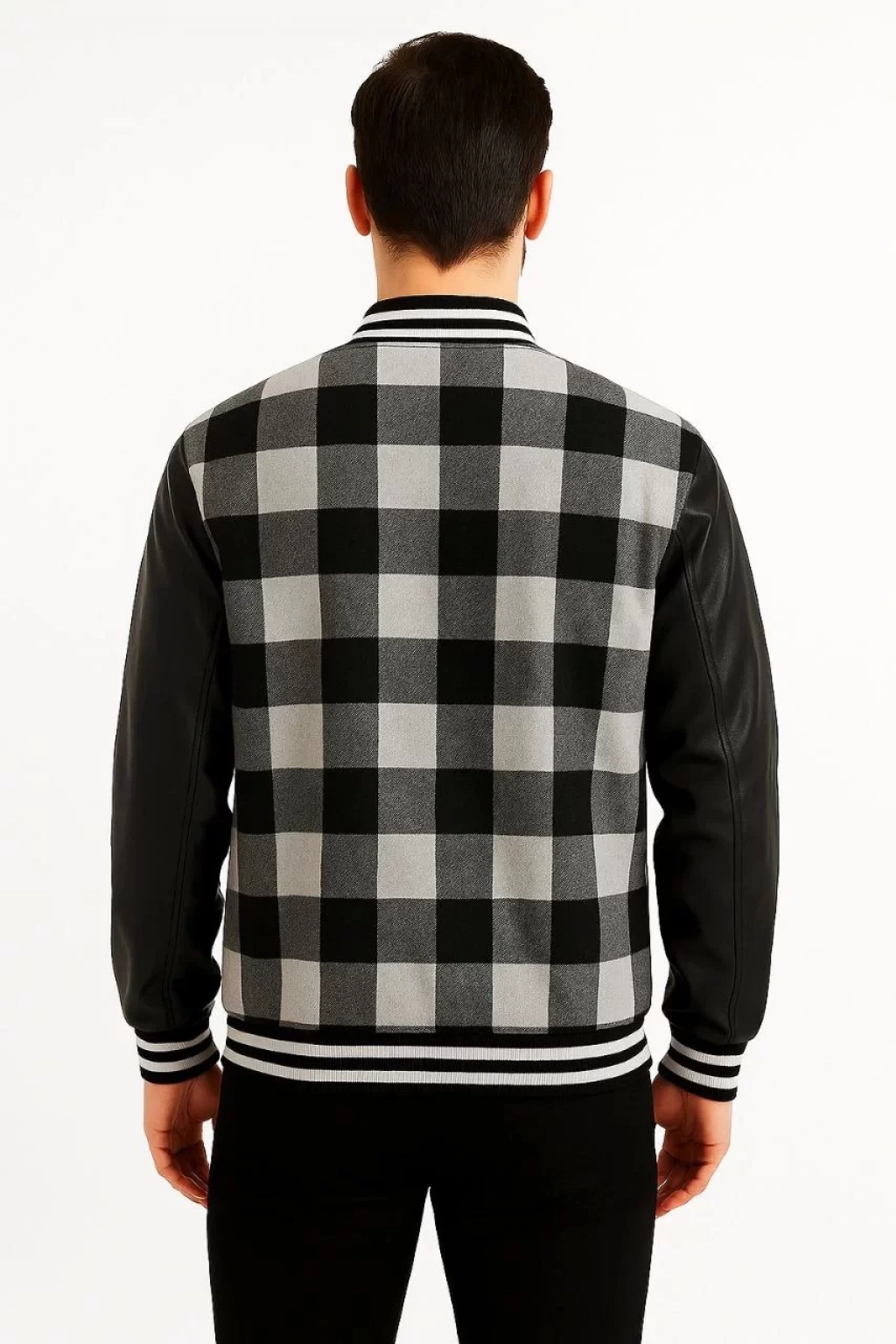 Erkek Kolej Ceket – Kareli Oduncu Kumaş, Kolları Suni Deri, Fermuarlı, İçi Kapitone Astarlı, Nakışlı Oversize Bahar & Kış Stil - Gri