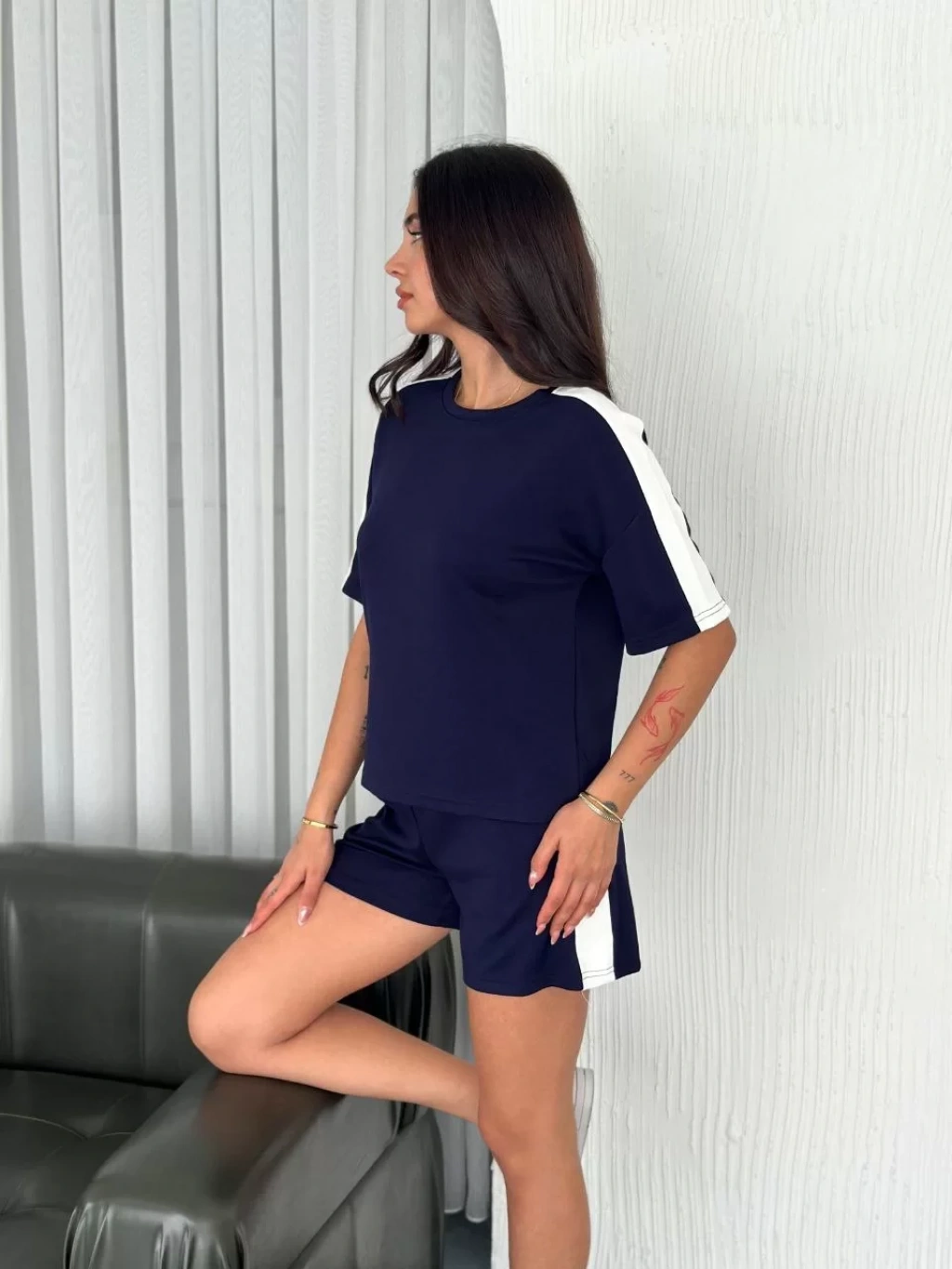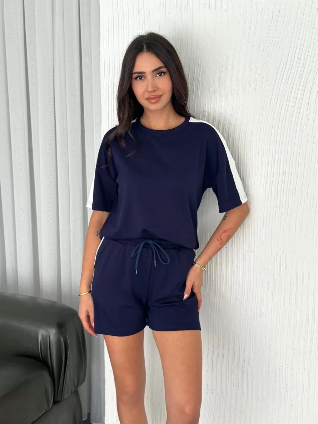 Osy Modal yumuşak dokulu Kumaş Kadın Parçalı Bisiklet Yaka T-shirt Kısa Şort İkili Takım - Mavi