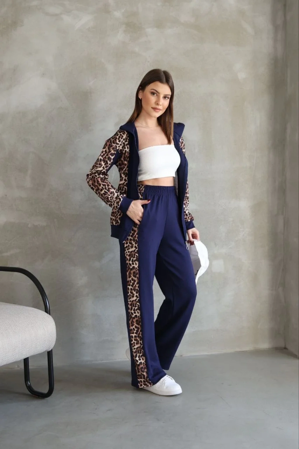 Osy Modal Yumuşak Dokulu Kumaş Kapüşonlu Leopar Desenli Fermuarlı Takım - Lacivert