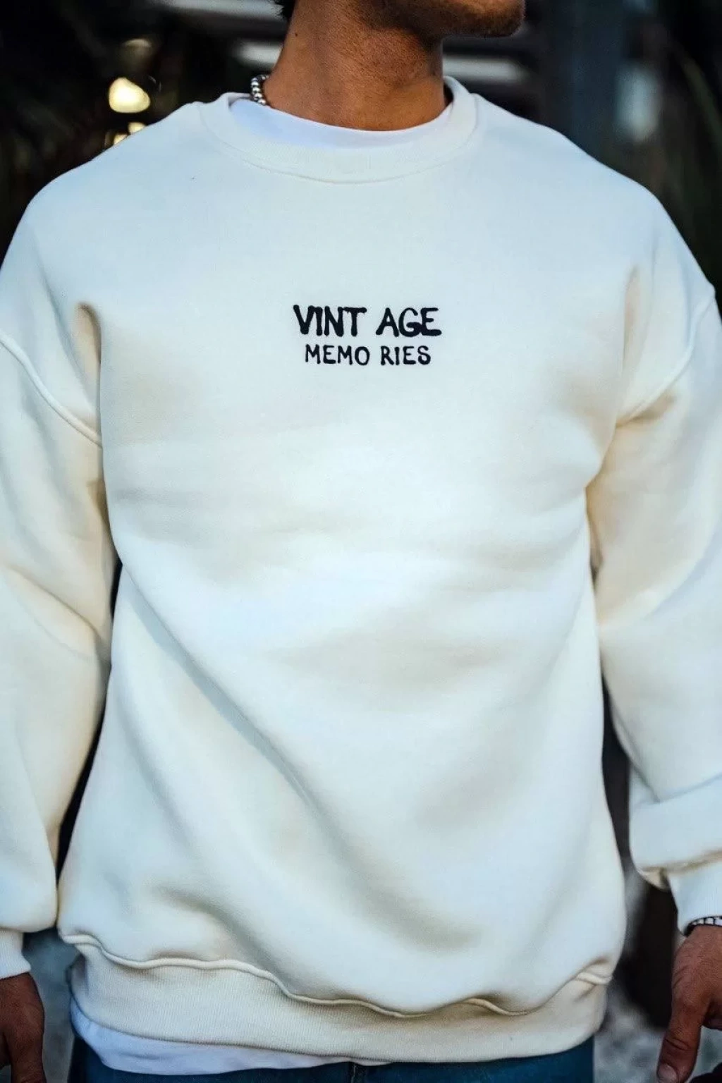 Oversize Bisiklet Yaka Üç İplik Baskılı SweatShirt - Beyaz