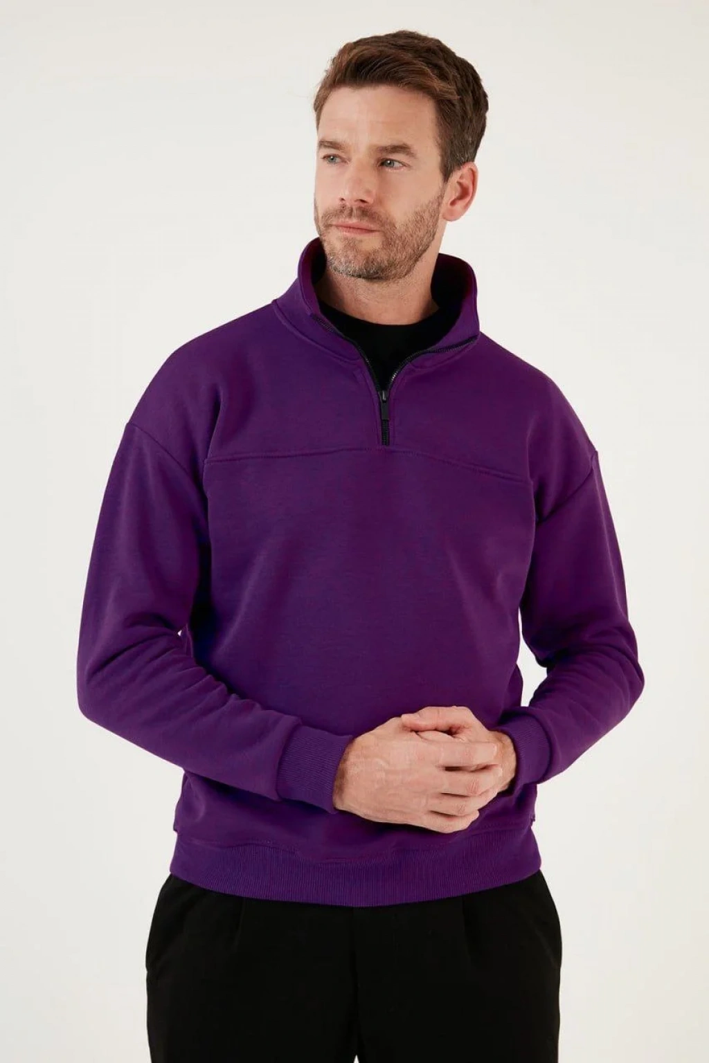 Oversize Yarım Farmuarlı Yakalı Basic SweatShirt - Mor