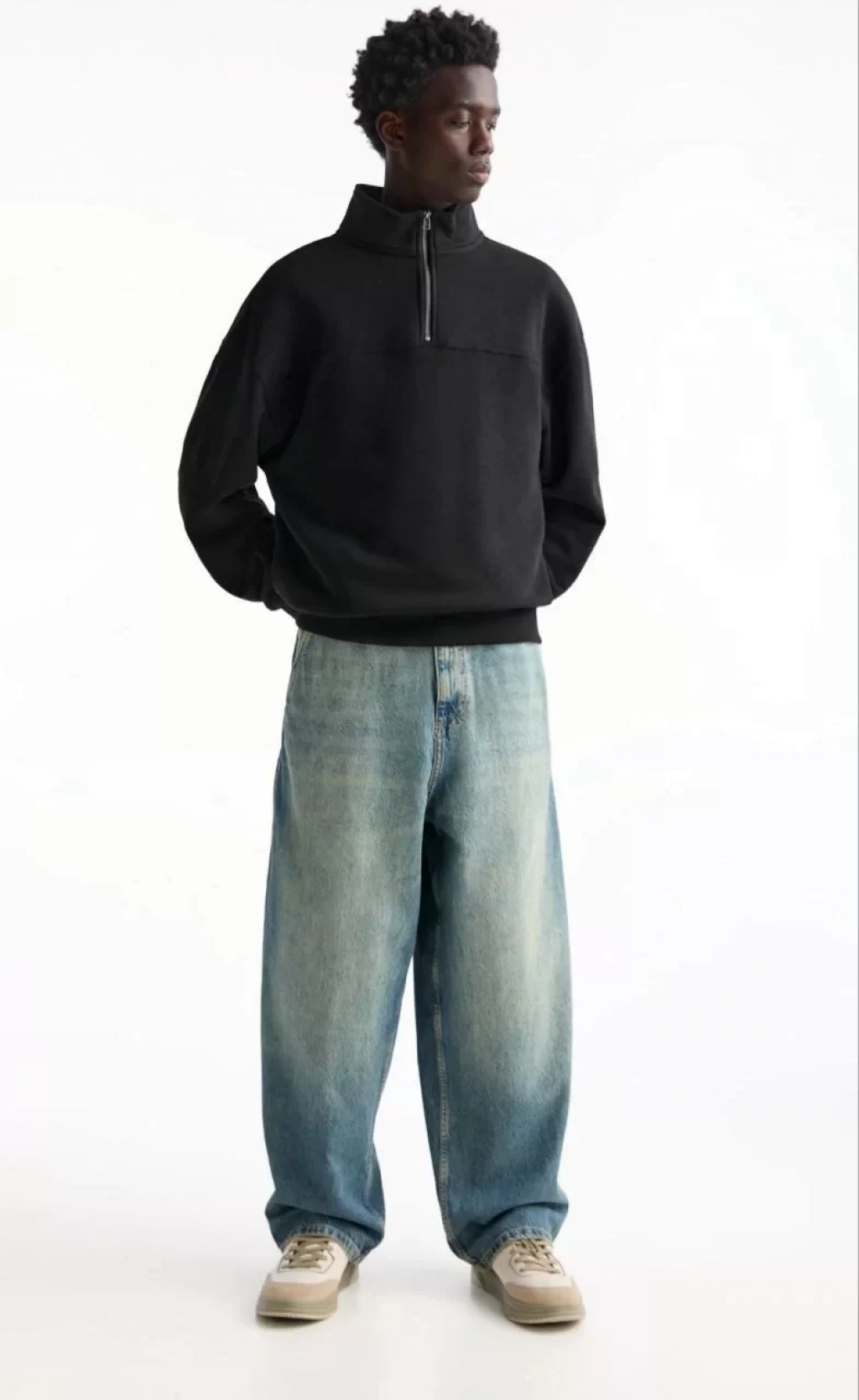 Oversize Yarım Farmuarlı Yakalı Basic SweatShirt - Siyah