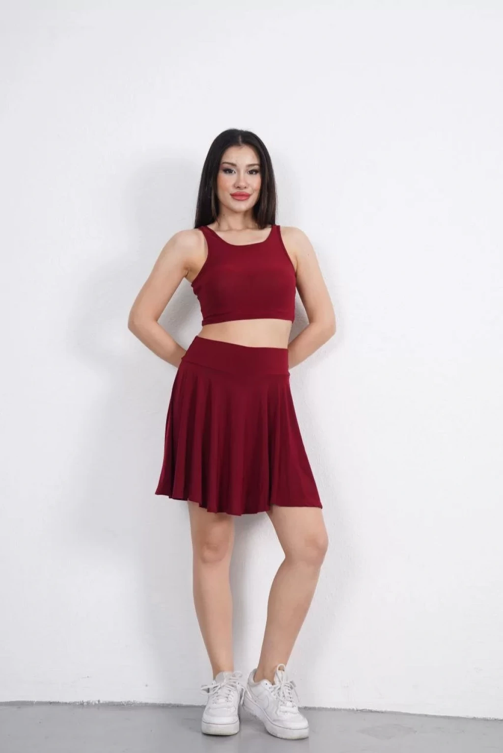 Sendy Kumaş Bisiklet Yaka Crop Şortlu Etek ikili Takım - Bordo