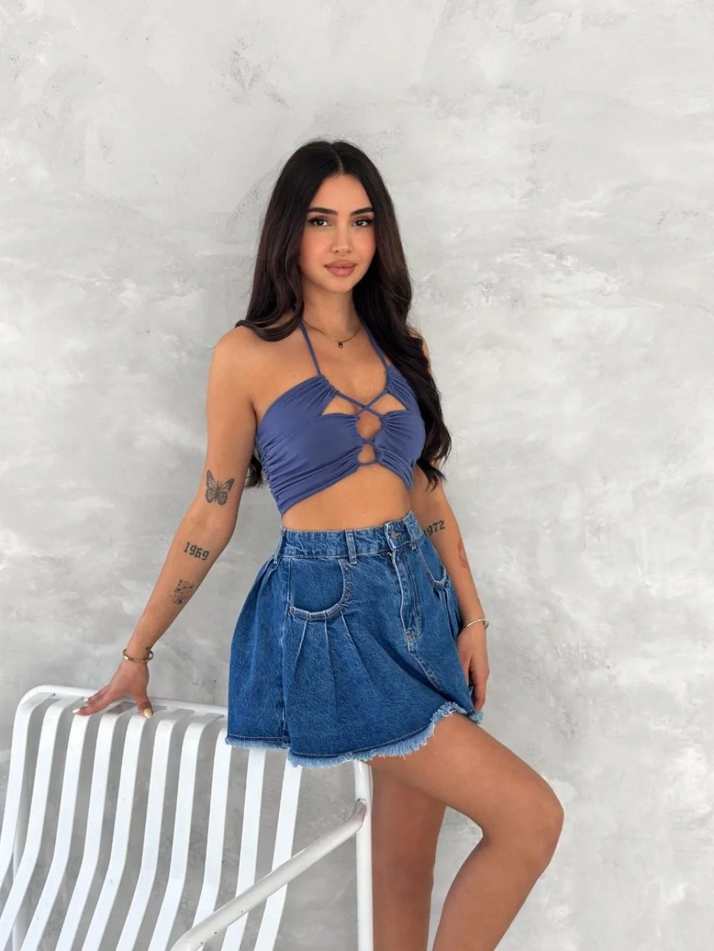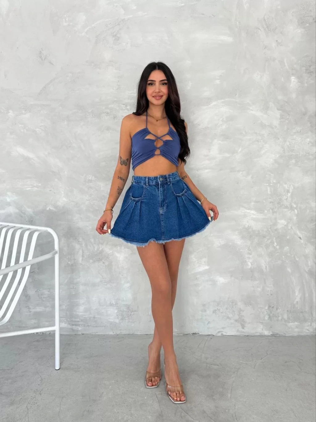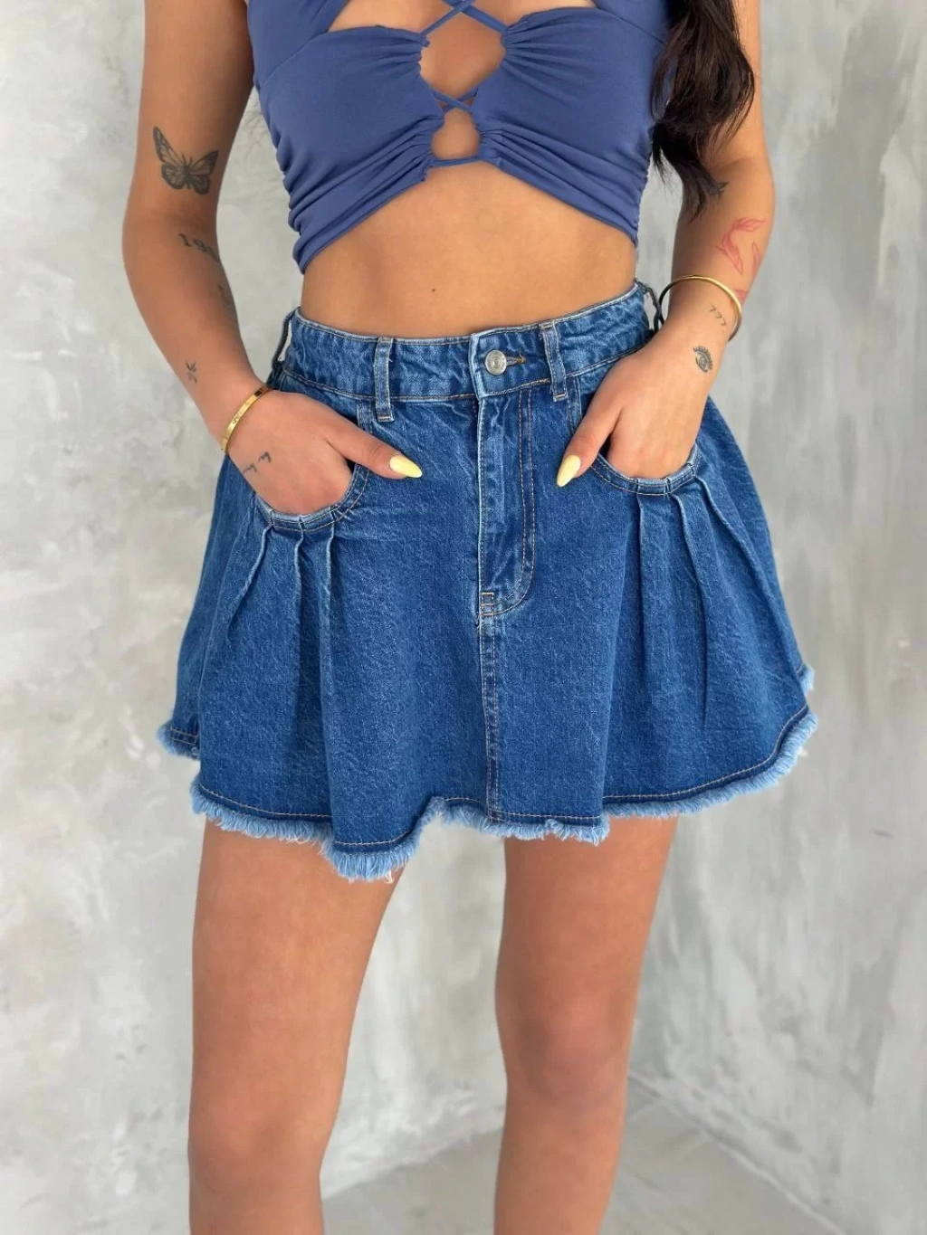 Şık Pileli Yazlık Mini Etekli Kot- Saks Mavisi