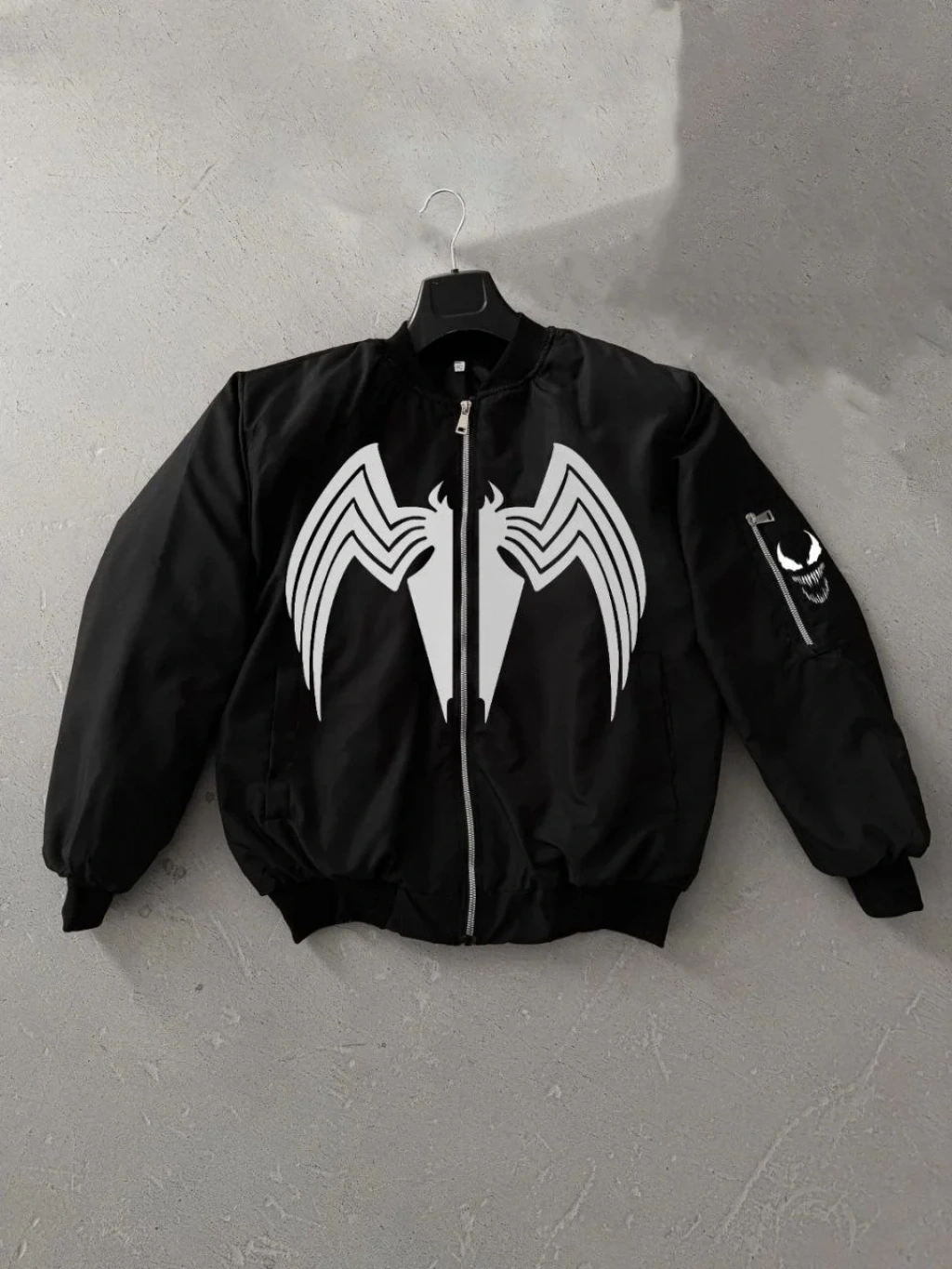 Unisex Siyah Bomber Mont – Venom Beyaz Örümcek Logolu, Fermuarlı Cepli, Kapitone Astarlı Günlük Mont - Siyah