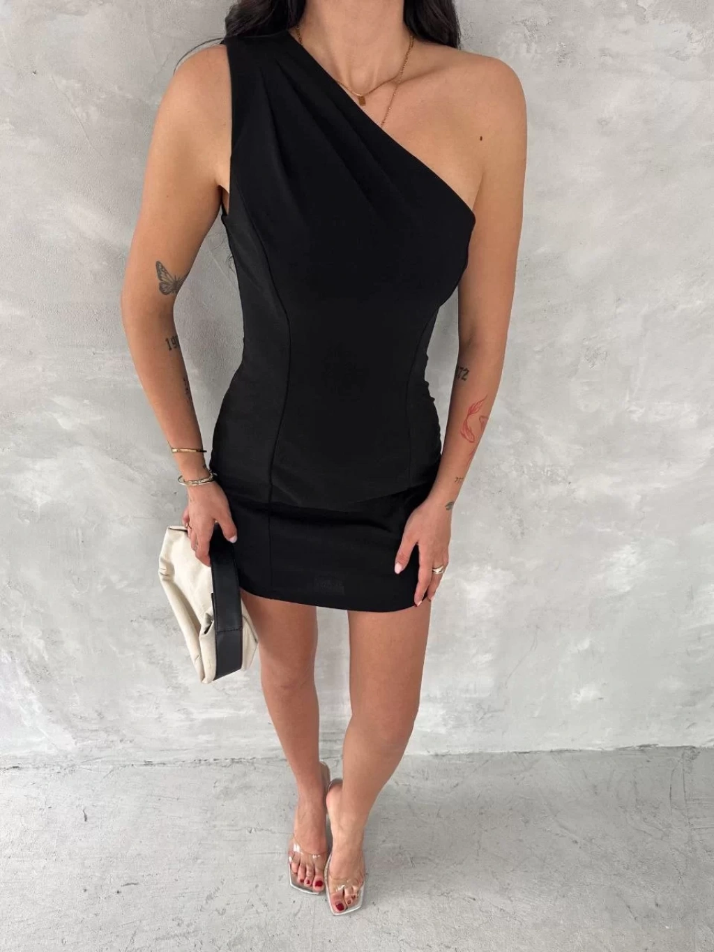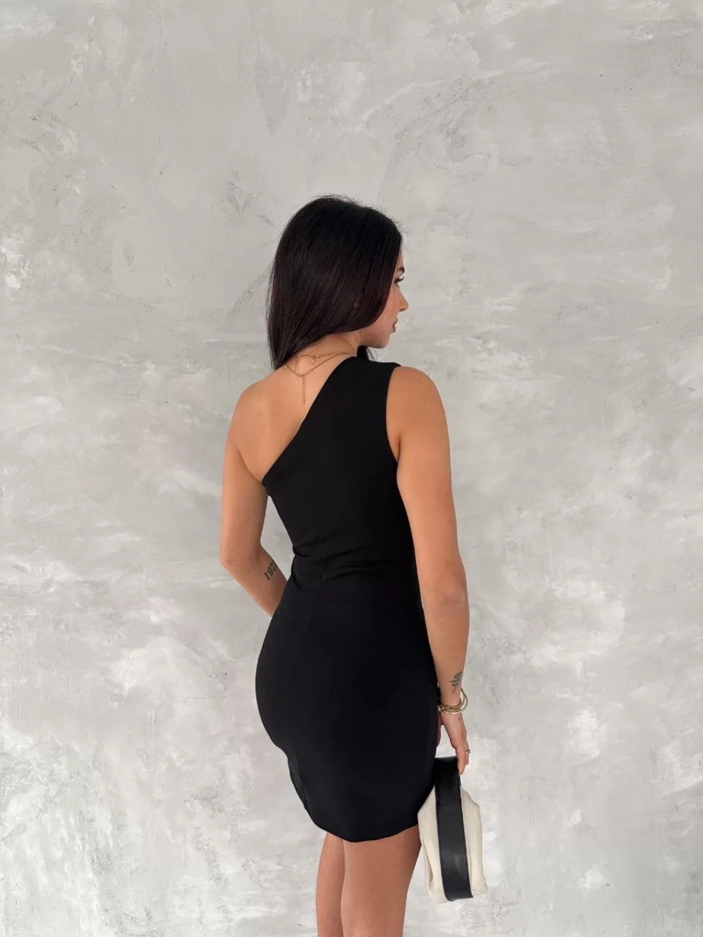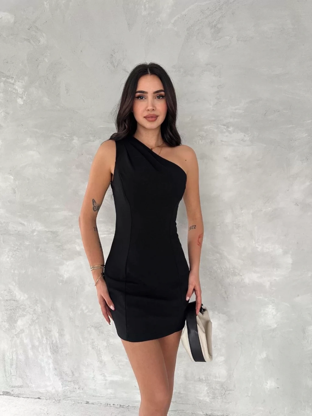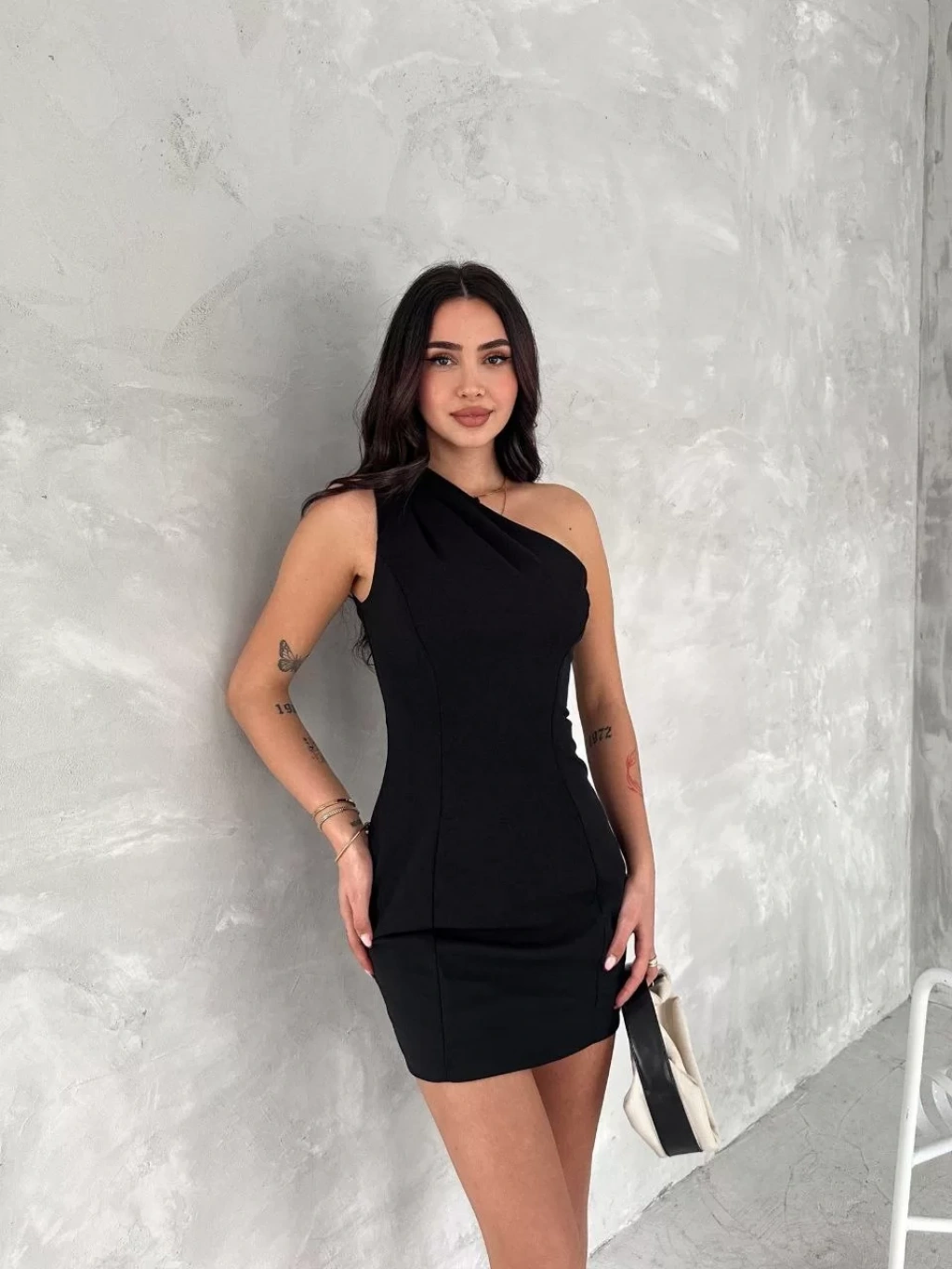 Tek Omuzlu Kolsuz Mini Boy Elbise - Siyah