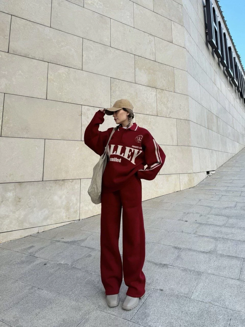 Üç İplik Yakalı Sweat Baggy Pantalonlu Takım - Bordo
