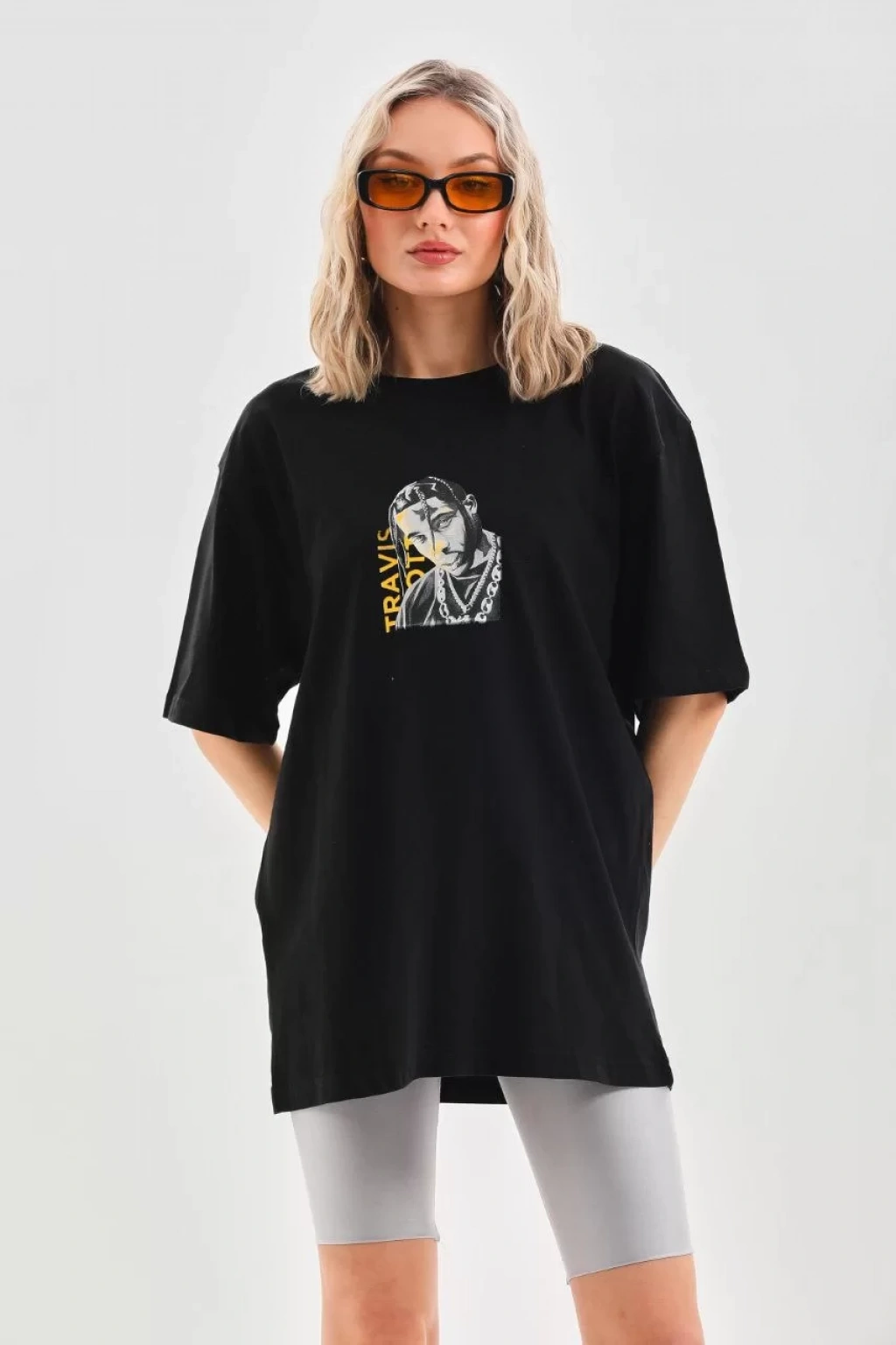 Unisex Baskılı Oversize T-Shirt - Siyah