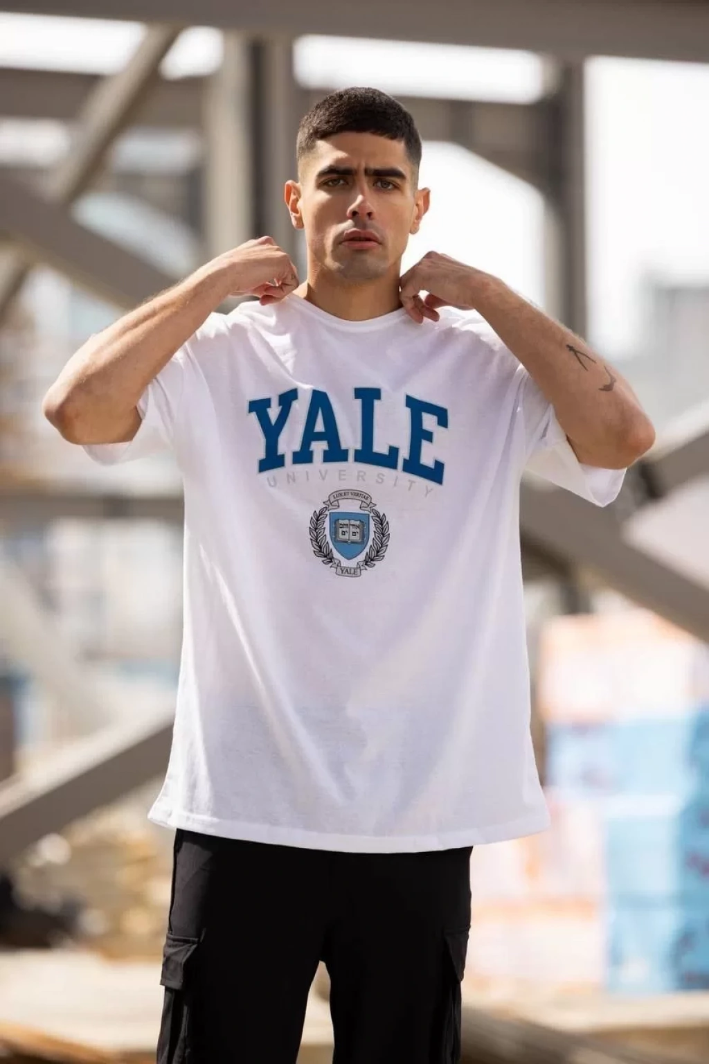 Unisex Bisiklet Yaka Baskılı Oversize T-Shirt - Beyaz