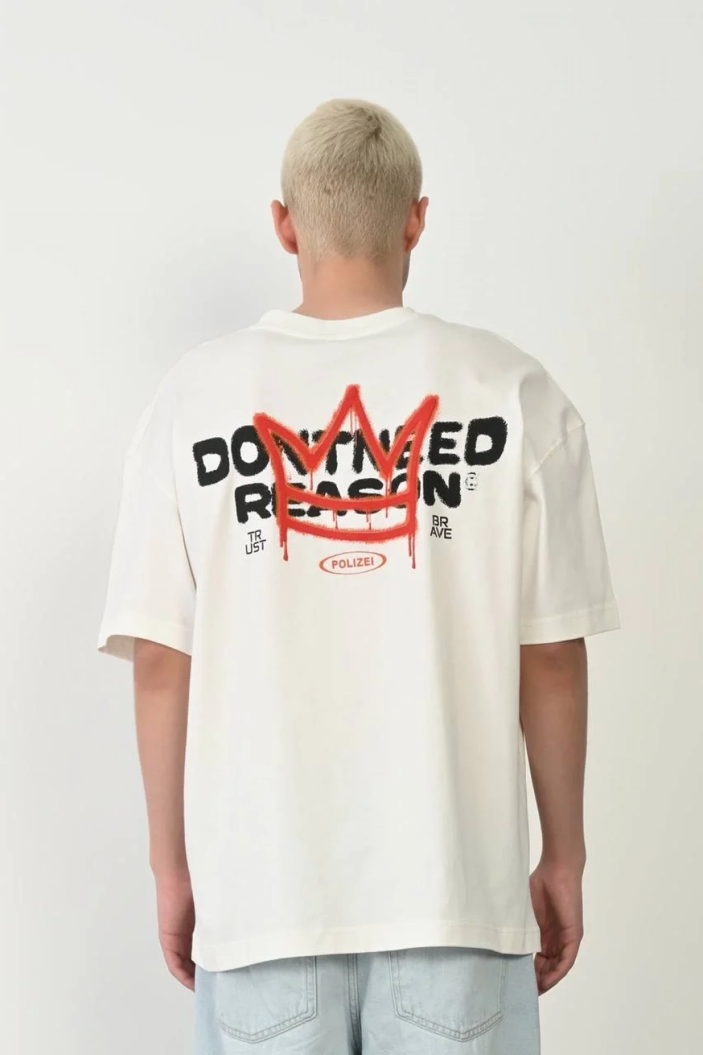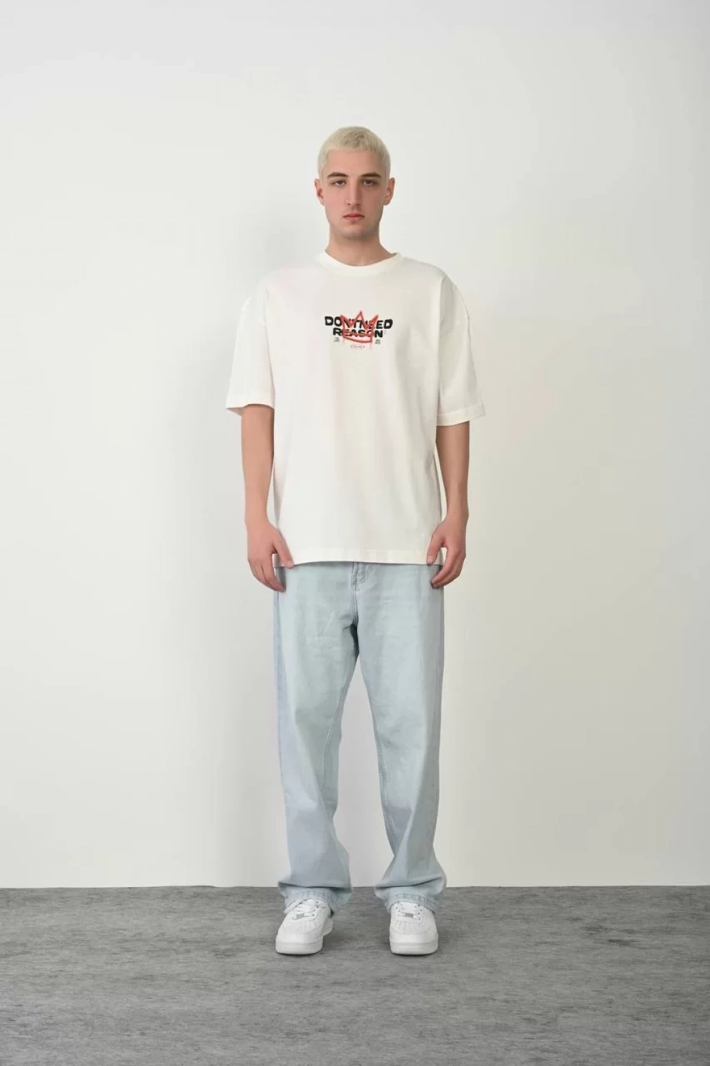 Unisex Bisiklet Yaka Baskılı Oversize T-Shirt - Beyaz