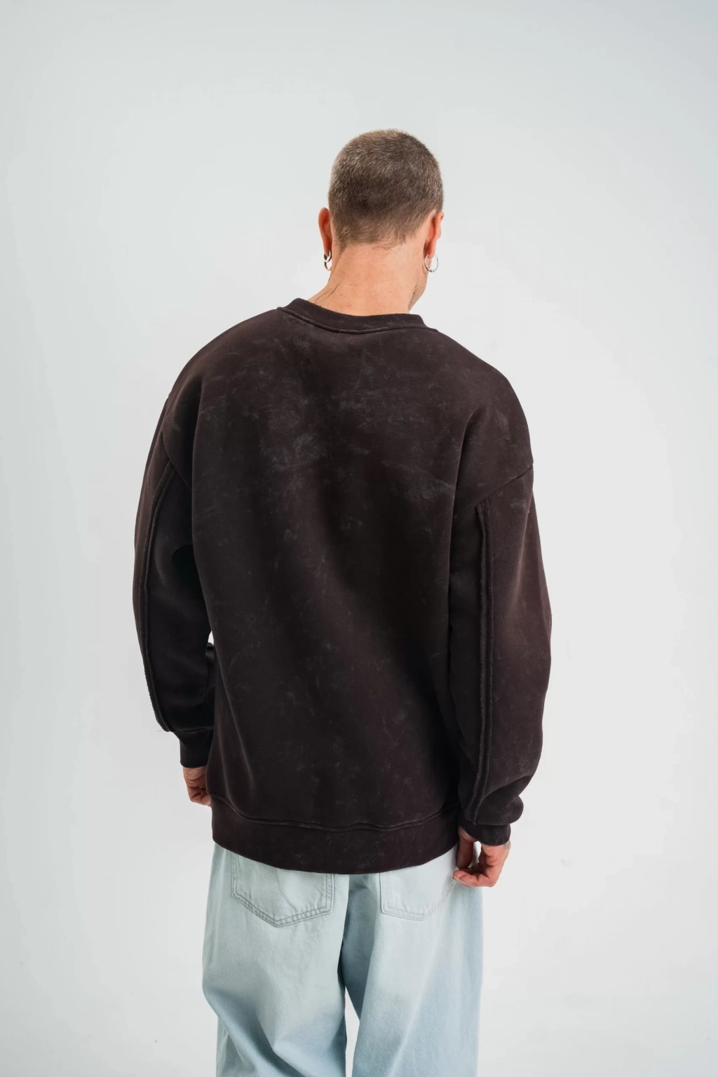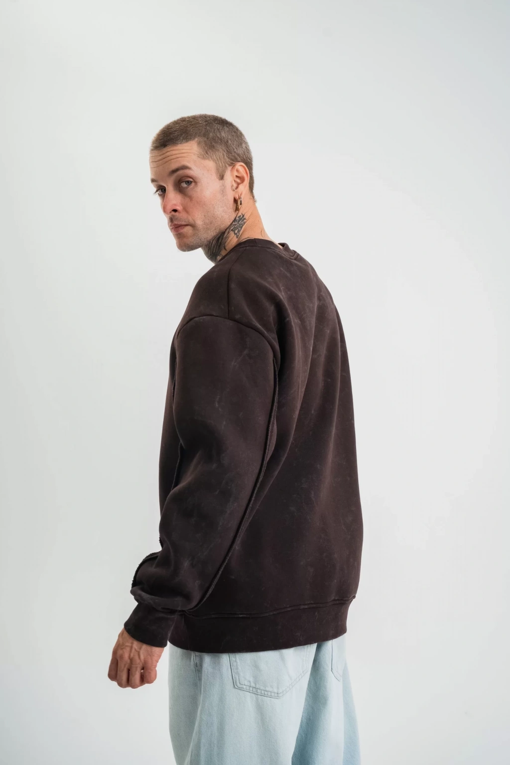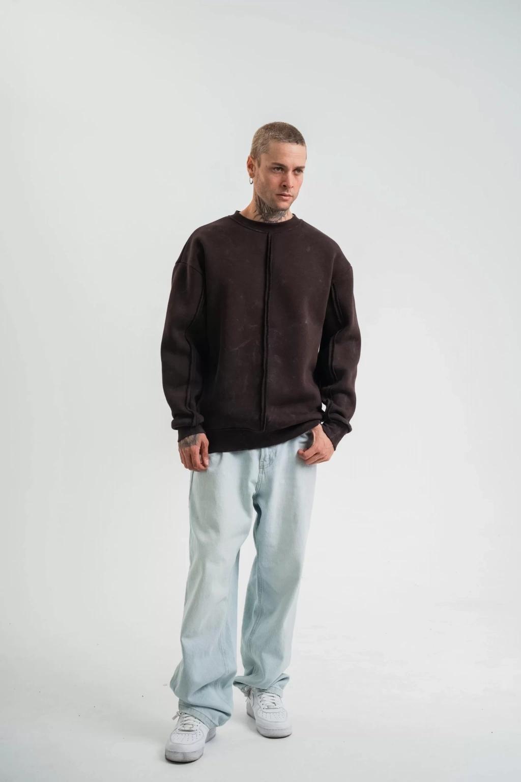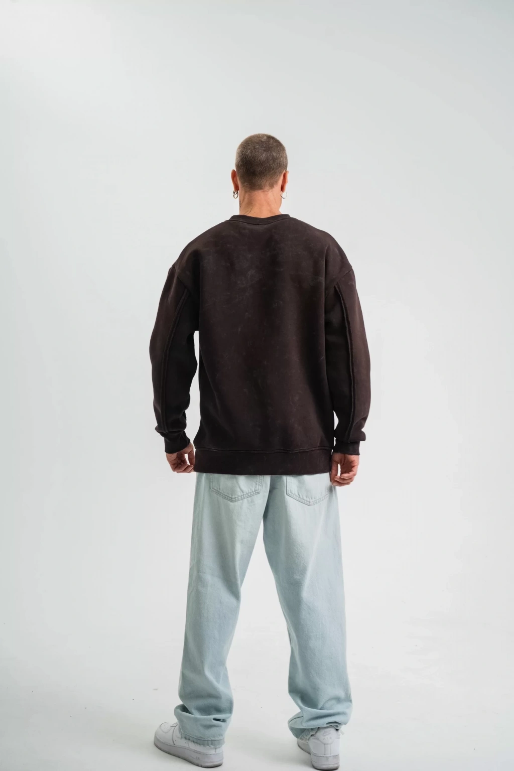 Unisex Bisiklet Yaka Özel Pis Dikişli Yıkamalı SweatShirt - Kahve