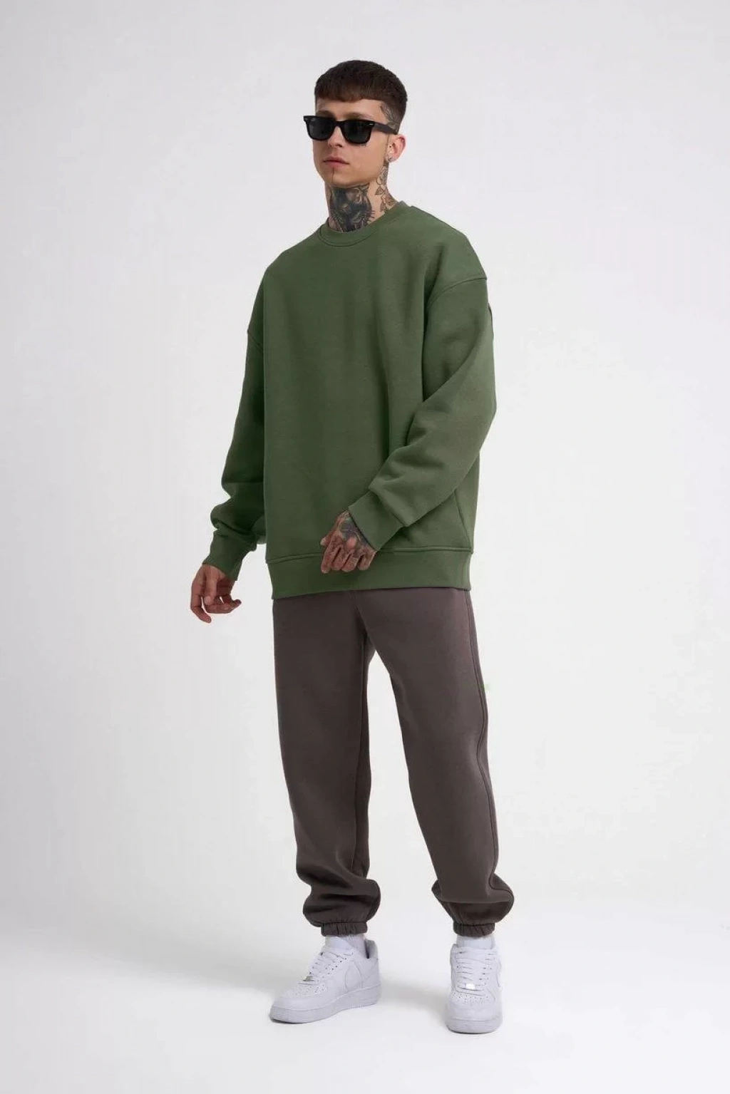 Unisex Biskilet Yaka Üç İplik SweatShirt - Haki