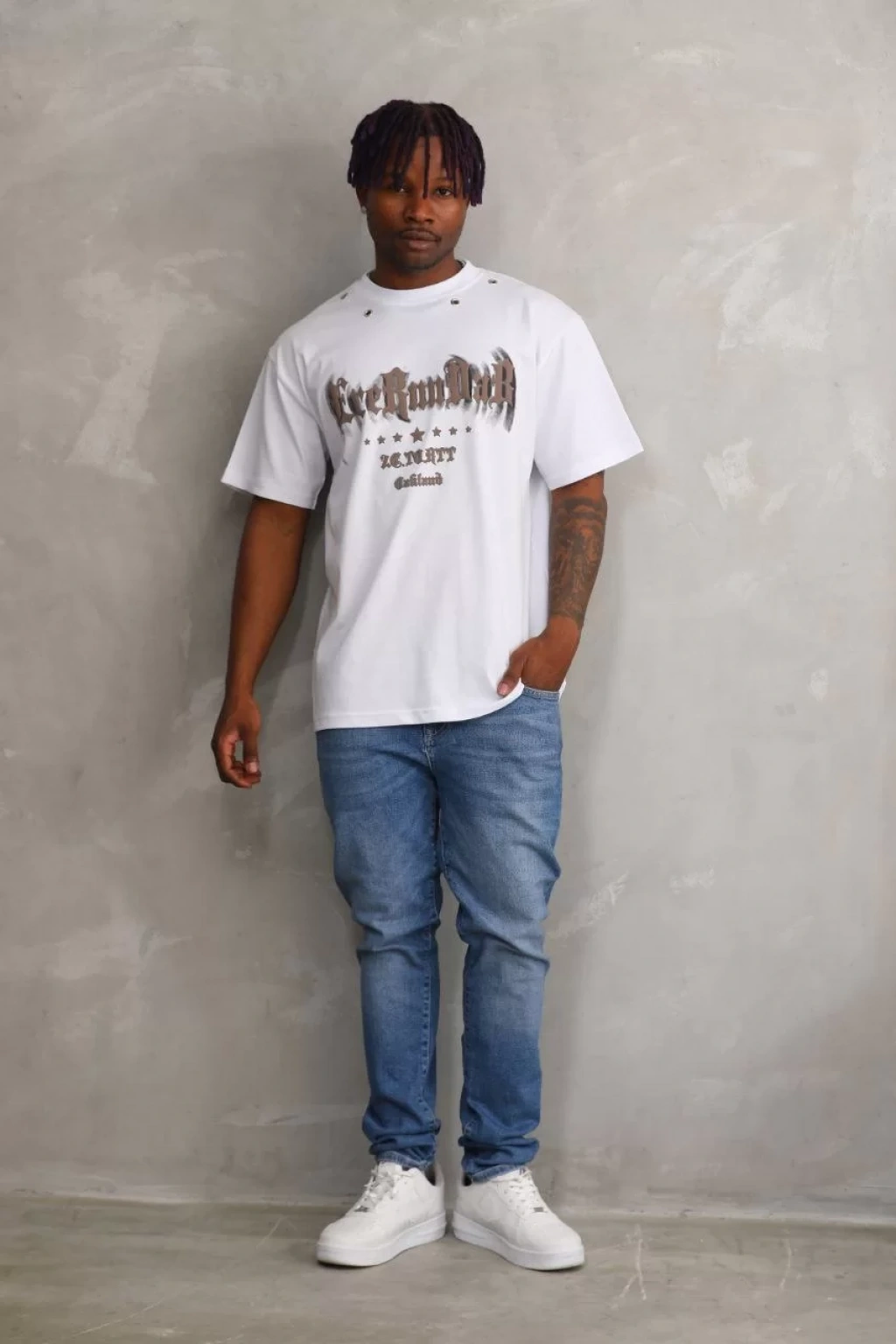 Unisex Kuşgözü Detaylı Baskılı Oversize T-Shirt - Beyaz