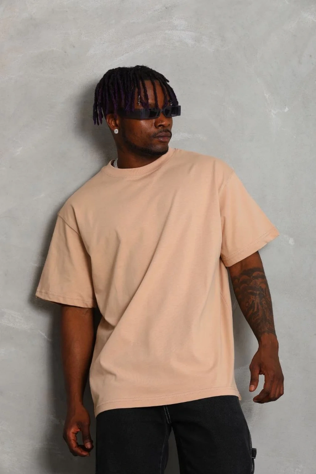 Unisex Oversize Düz Bisiklet Yaka T-Shirt - Bej