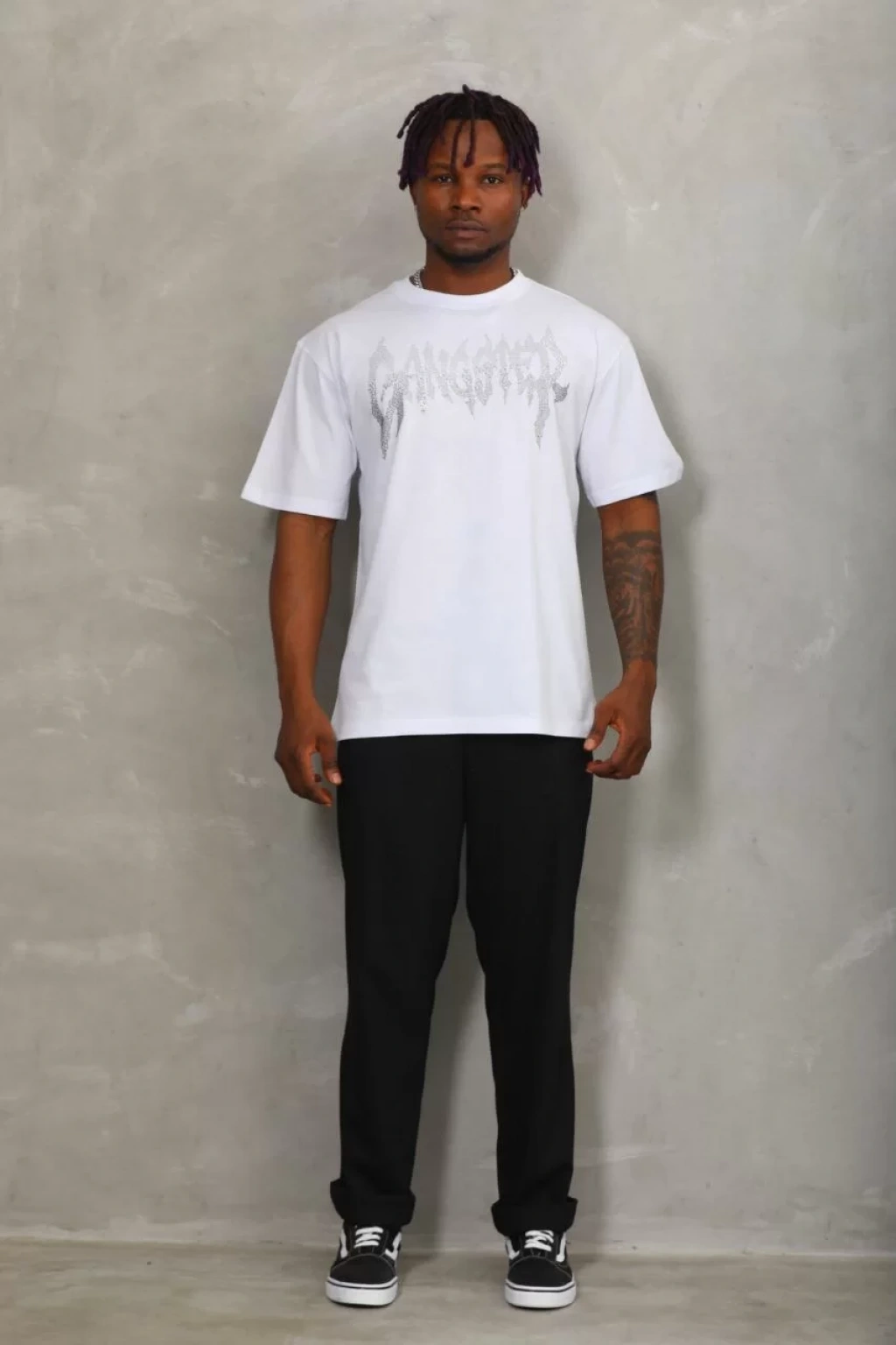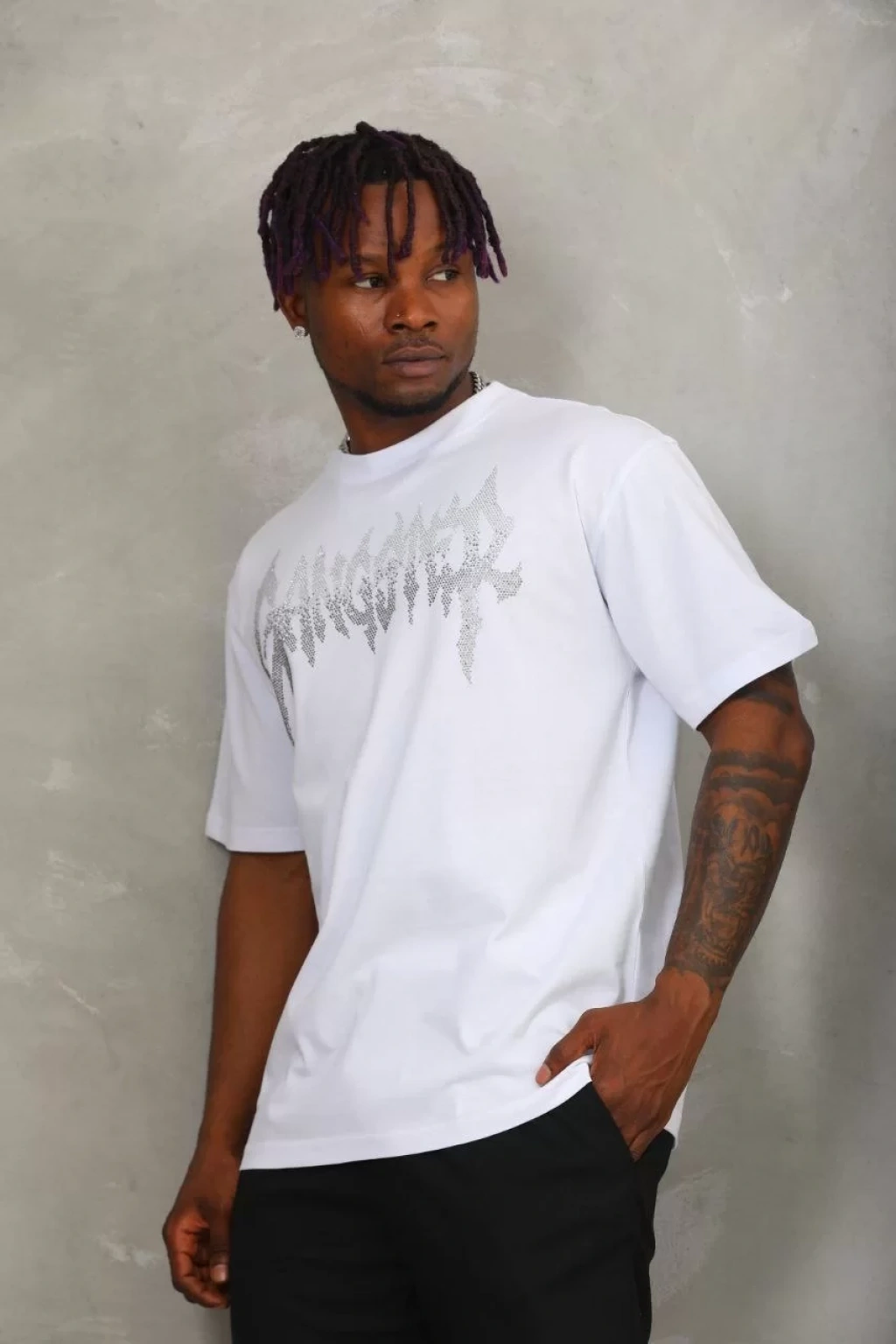 Unisex Oversize Taşlı Bisiklet Yaka T-Shirt - Beyaz