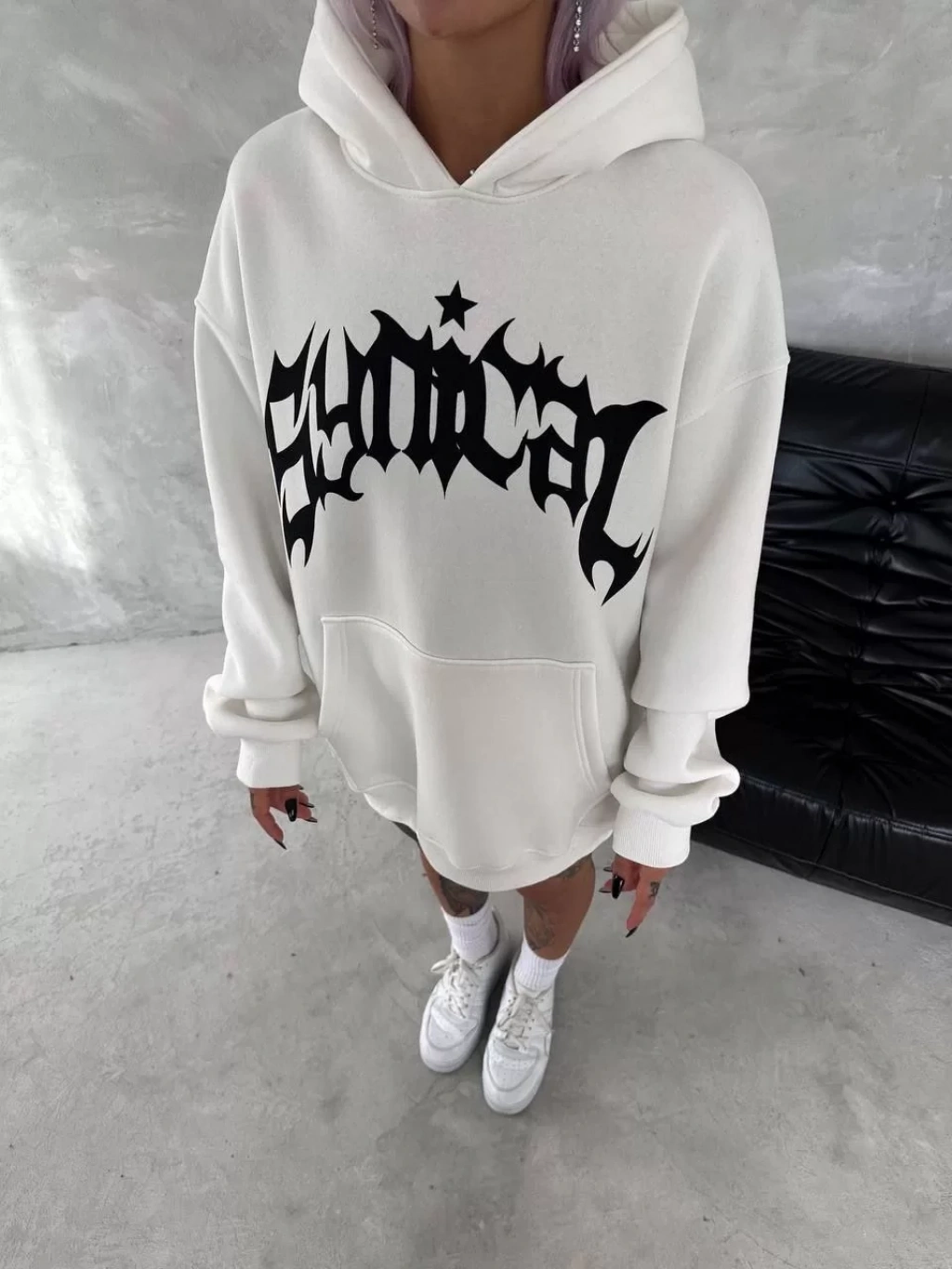 Unisex Üç İplik Kapüşonlu Baskılı SweatShirt - Beyaz