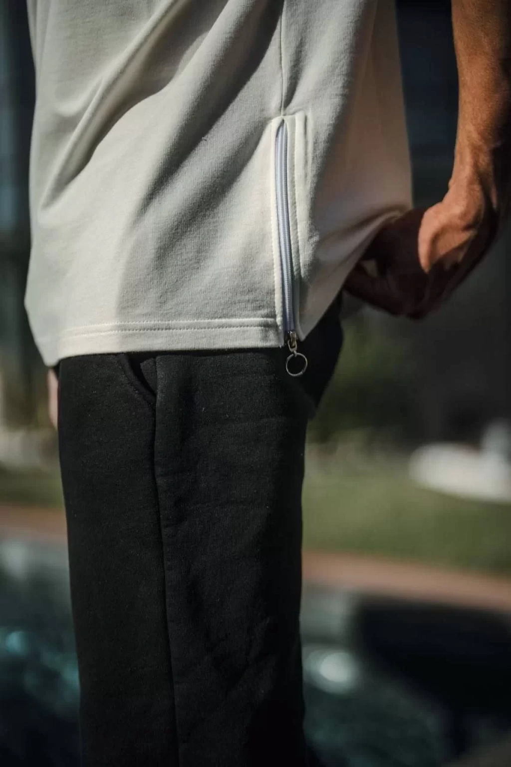 Unisex Yandan Fermuarlı Parçalı T-Shirt - Beyaz