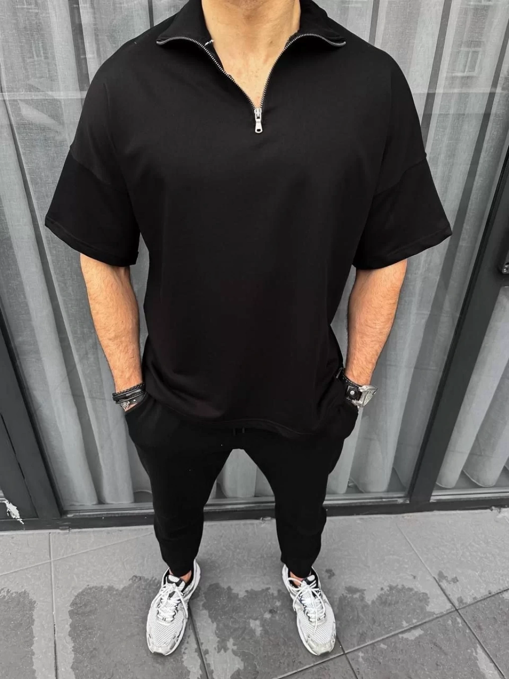 Unisex Yarım Fermuarlı Basic T-Shirt - Siyah