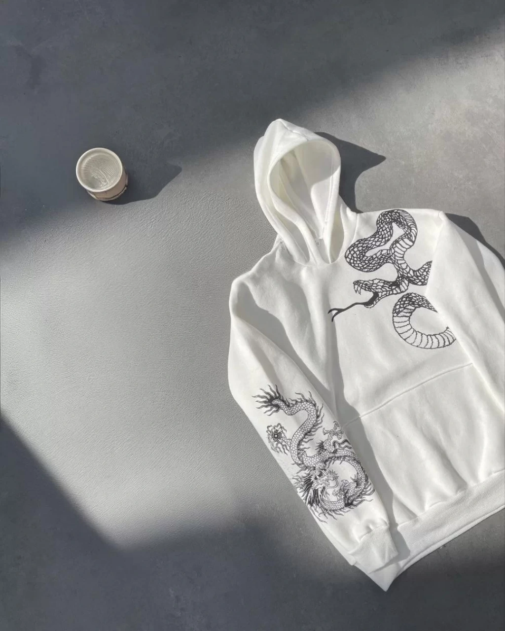 Uzun Kol Kapüşonlu Baskılı SweatShirt - Beyaz
