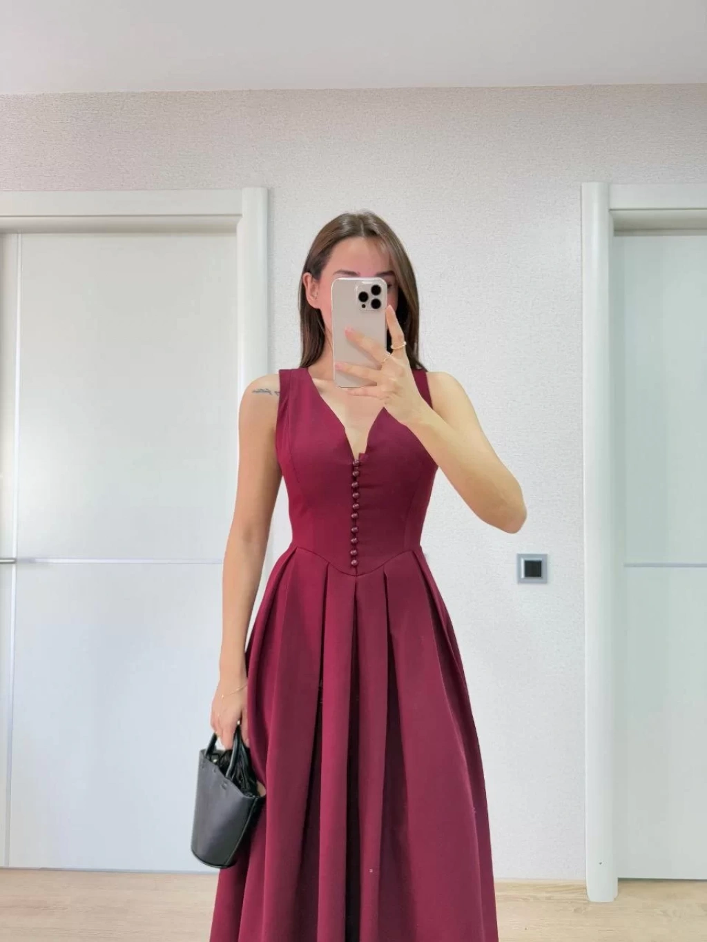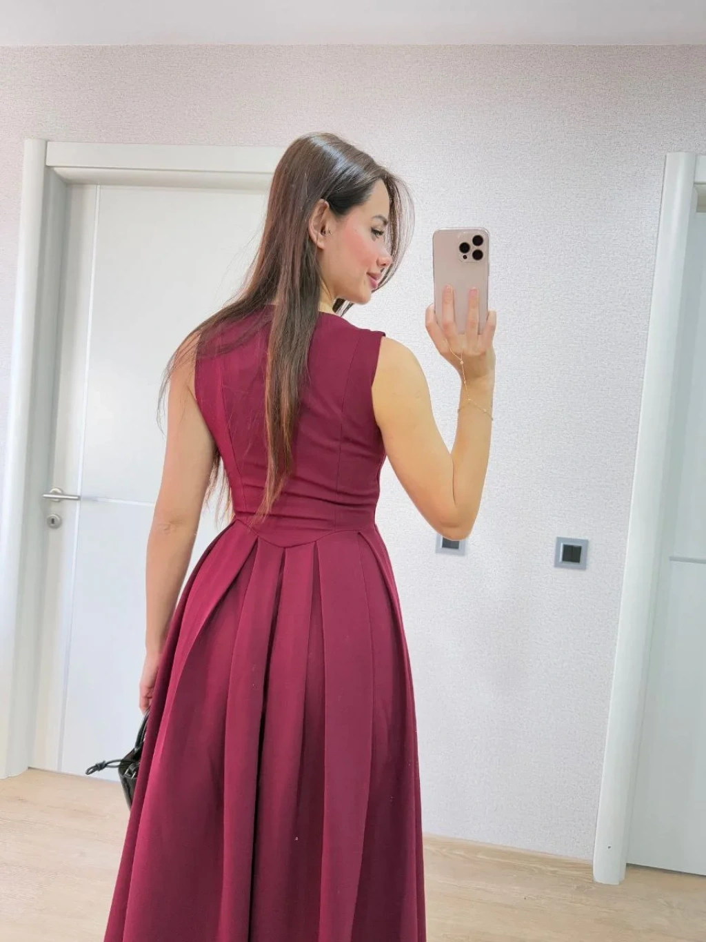 V yaka Krep Arka Ön Pens Detaylı Uzun Kolsuz Elbise - Bordo